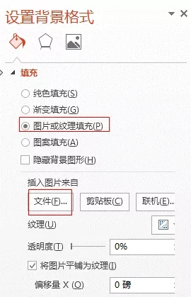 2.在“设置布景格局”中,挑选“图片或纹理填充”。