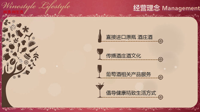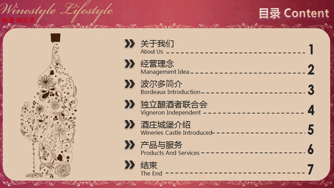 一份比较精巧的葡萄酒公司介绍PPT模板,欧美古典风格,酒赤色的主色调和主题配合,内页采用各种红酒元素设计。