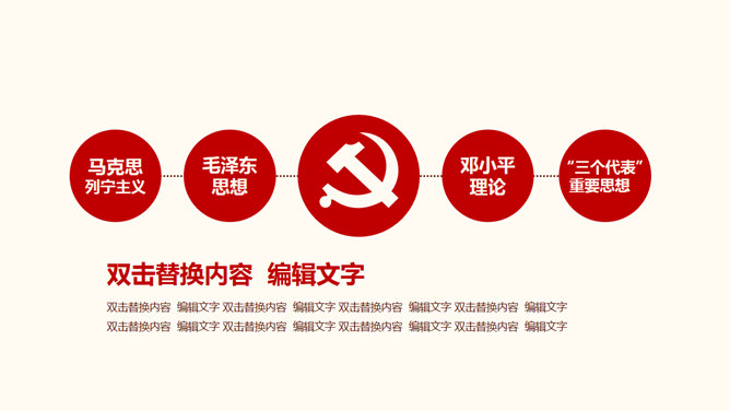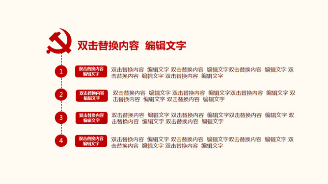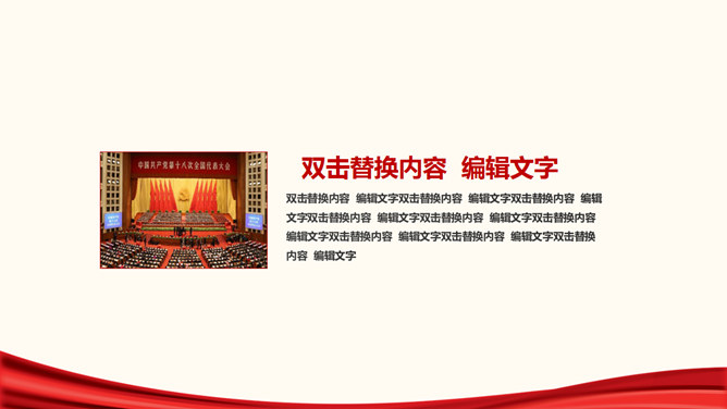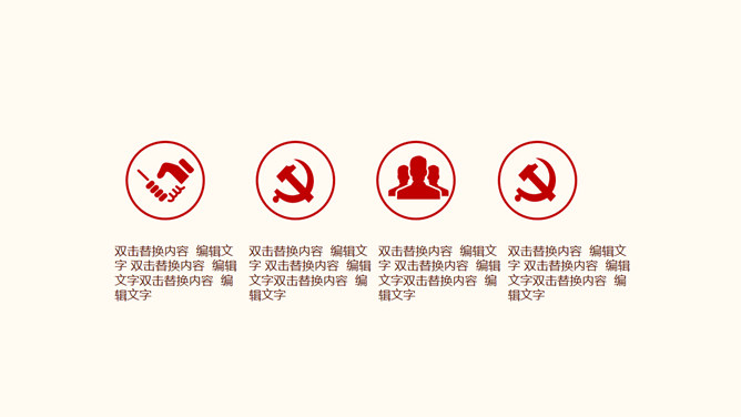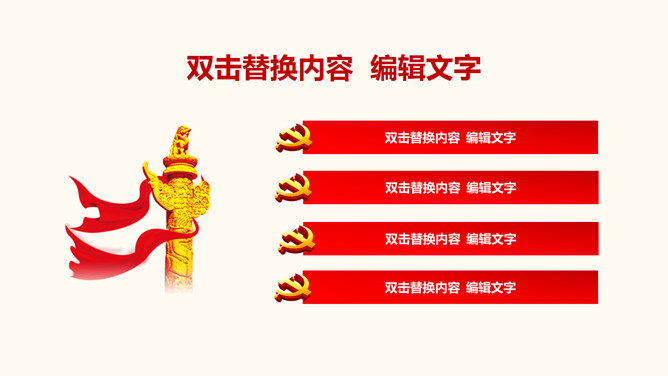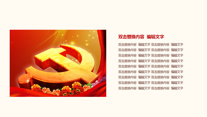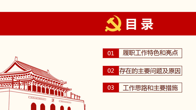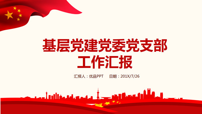 一份动态演示作用的党支部党建工作总结PPT模板,赤色主色调,封面页以国旗党徽为背景元素,包含目录页和内容页。