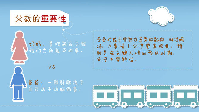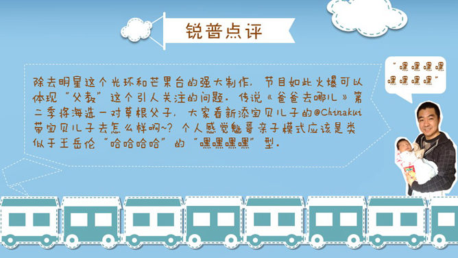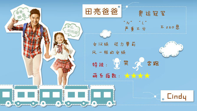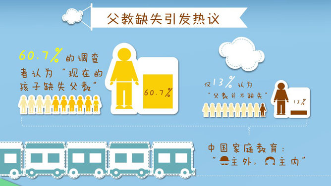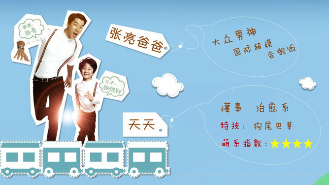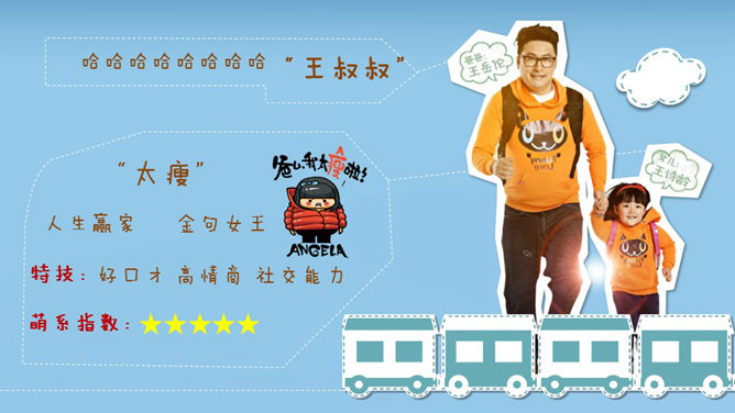 这是一份设计非常精美的优秀的PPT著作,漂亮的动态效果,剪贴画设计,由热映的爸爸去哪了引出父爱重要性的话题。运用字体:方正稚艺简体、方正喵呜体。