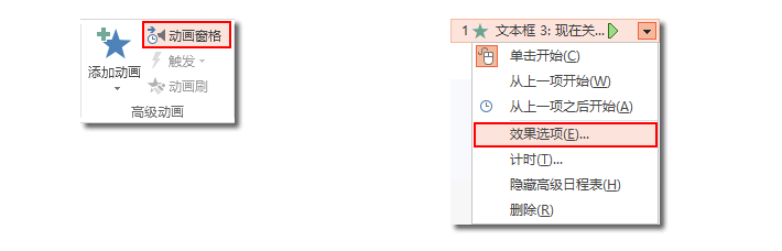 步骤二、翻开【动画】-【高档动画】-【动画窗格】,在右边弹出的【动画窗格】点击旁边的下拉三角按钮,然后选择【作用选项】。