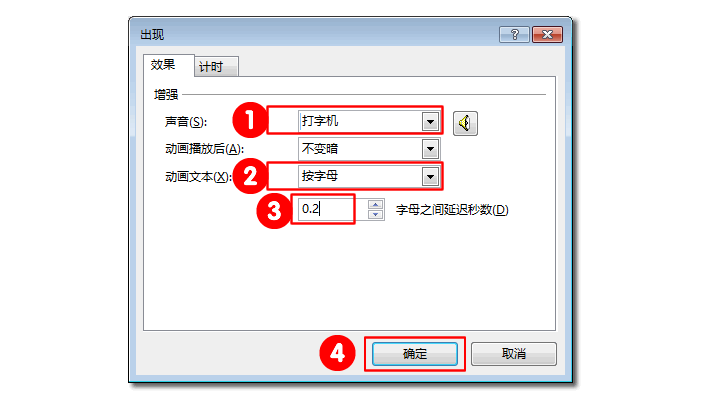 步骤三、在弹出的【出现】面板中我们在【作用】里面设置声音为:【打字机】;动画文本【按字母】;字母之间延迟描述:【0.2】,确认。