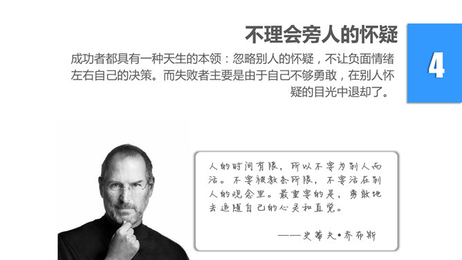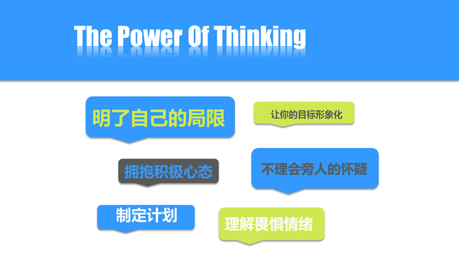这是一份励志主题的PPT著作,要想获得成功的人生需求具备的六种思想:1、明晰自己的局限。2、拟定计划。3、让你的方针形象化。4、不理会旁人的置疑。5、拥抱积极心态。6、战胜畏惧心情。使用字体:方正静蕾简体。