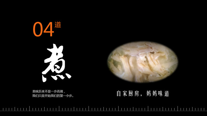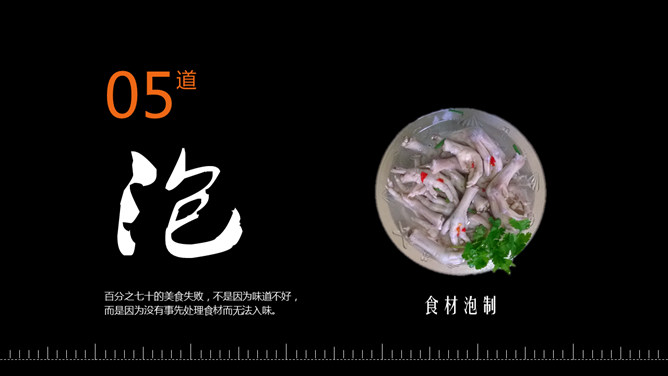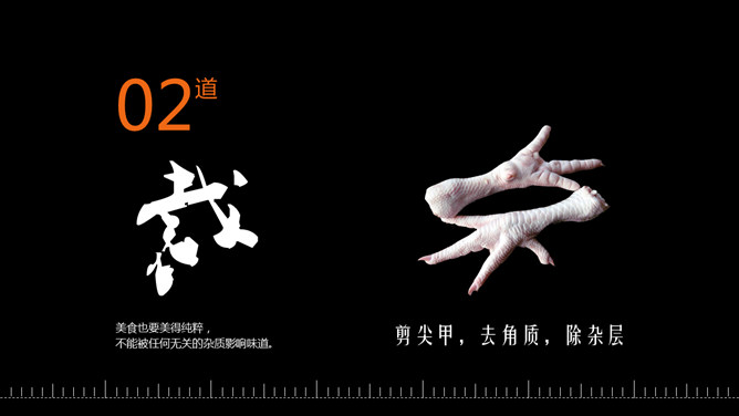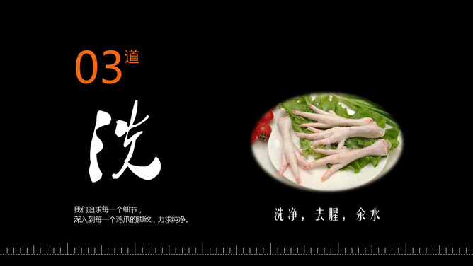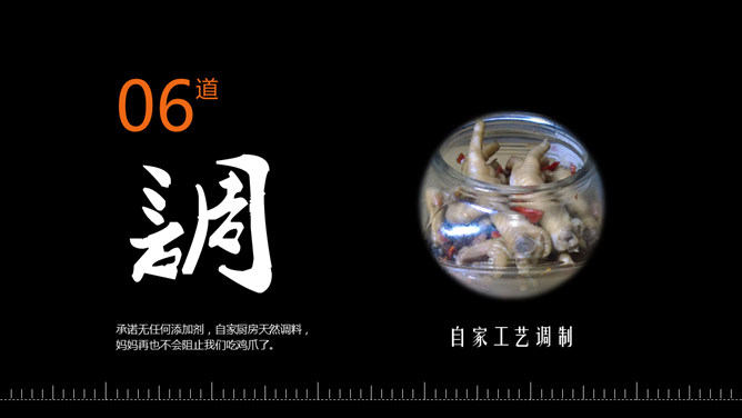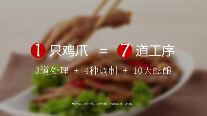 甘旨鸡爪私房菜宣扬PPT模板。一套美食相关幻灯片模板,介绍了鸡爪私房菜的制造工序,适合美食宣扬介绍。