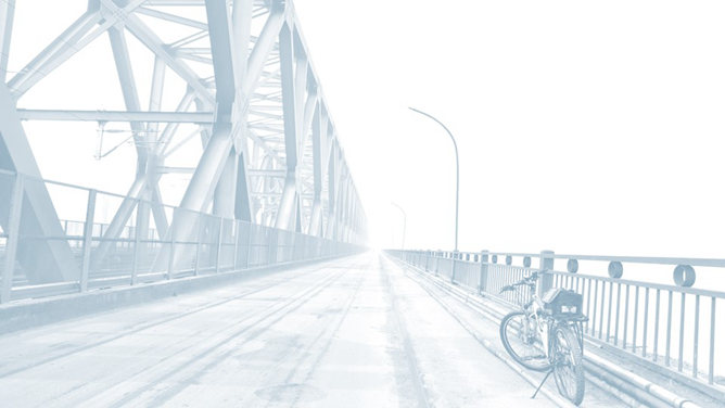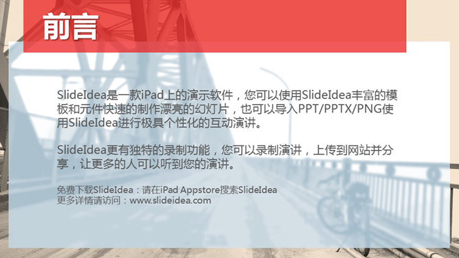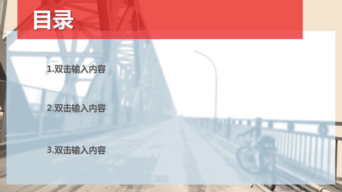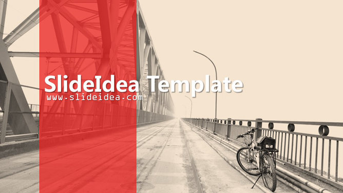 这是一份以自行车停在大桥上为布景的PPT模板,布景图片通过LOMO作用处理,给人随性唯美的感觉。