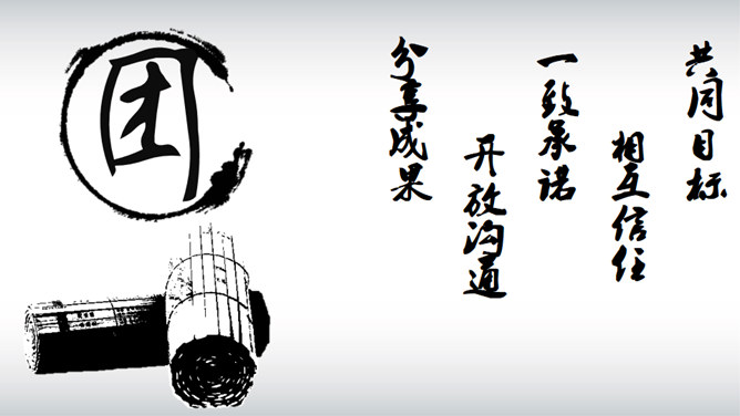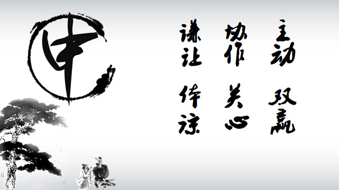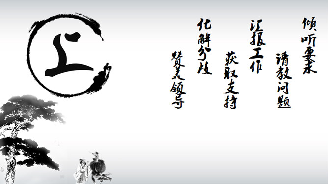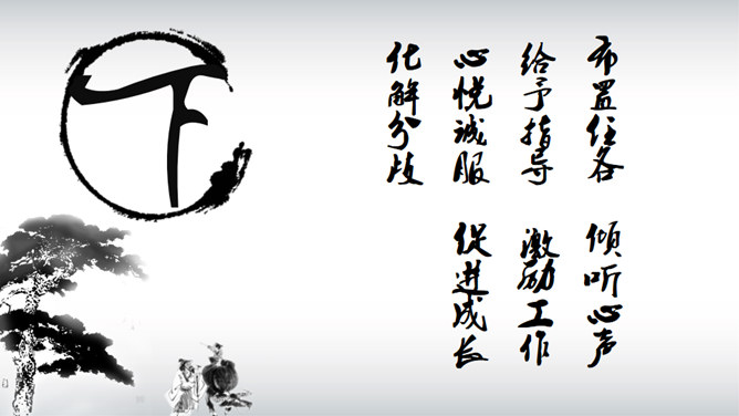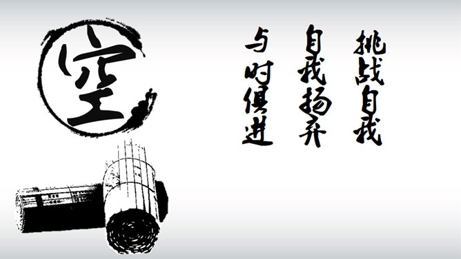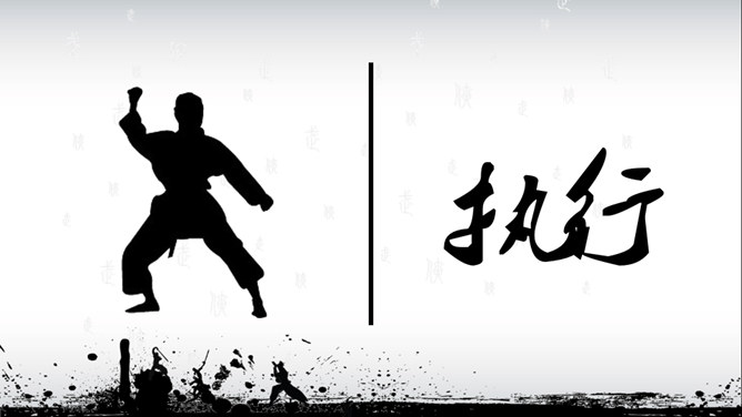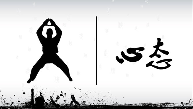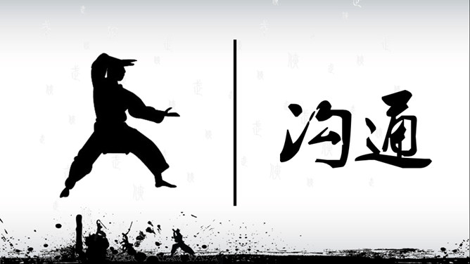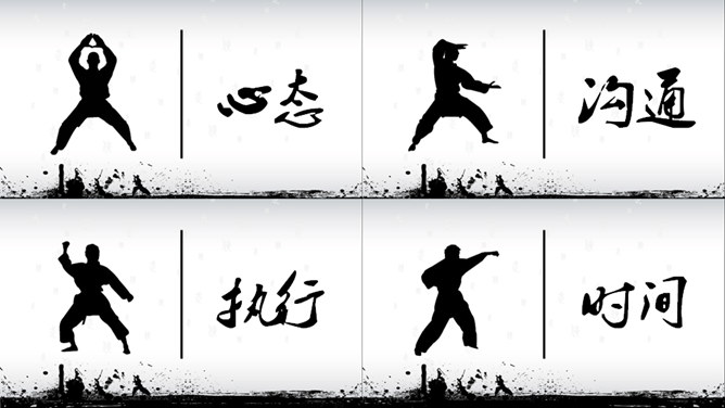 一份关于工作素质培训PPT课件,规划十分有创意,选用水墨武侠风格规划,内页包括各种功夫姿势,如同一本武林秘籍,包括心态、交流、履行、时间四部分内容的讲解。使用字体:叶根友毛笔行书、hakuyoxingshu7000、叶根友行书繁。