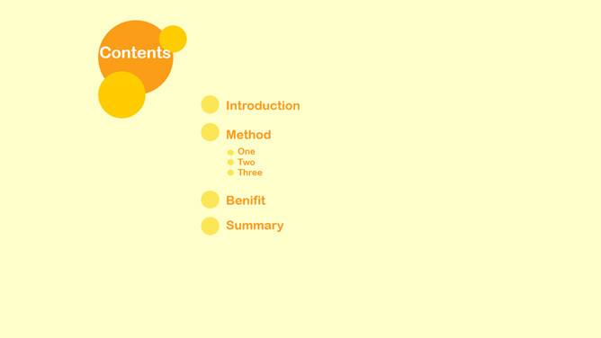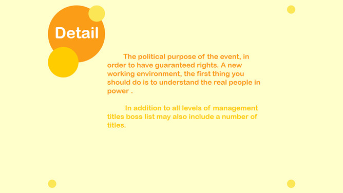 这是一份橙黄色背景的通用PPT模板,共5页,圆形圆圈装饰,风格简练,通用性强,用途广泛。