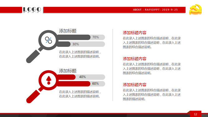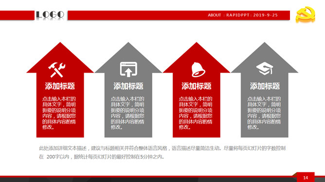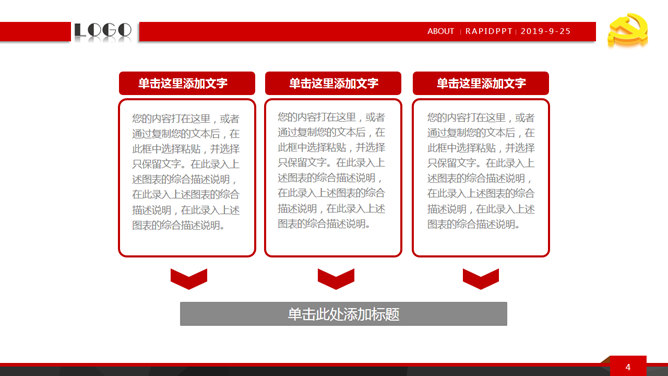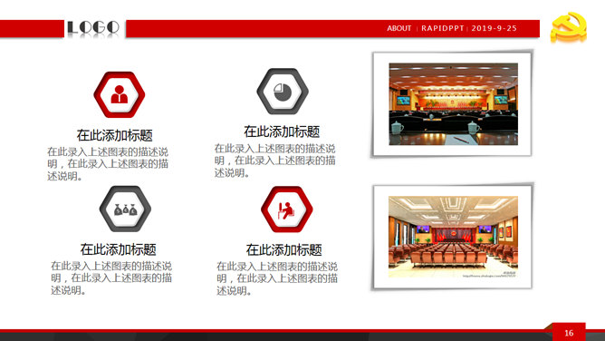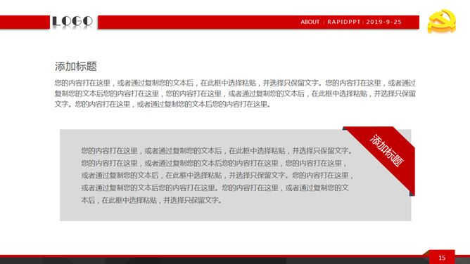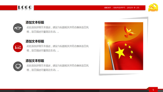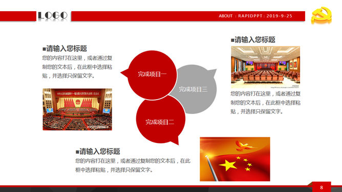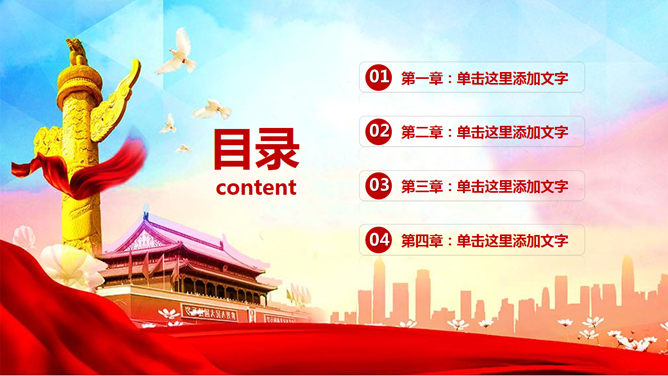 这是一份适合党建工作汇报运用的的PPT模板,以光芒万丈的天安门、党徽、红旗、和平鸽为背景,很漂亮的动态效果。