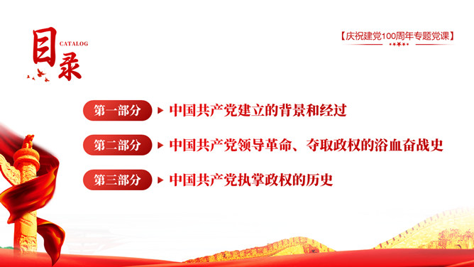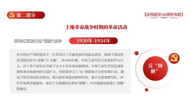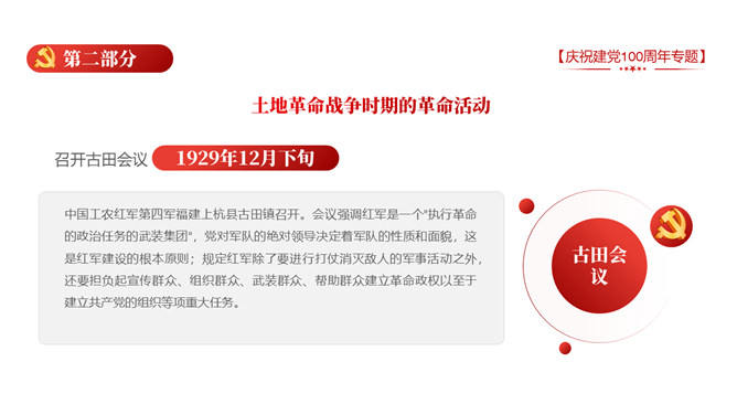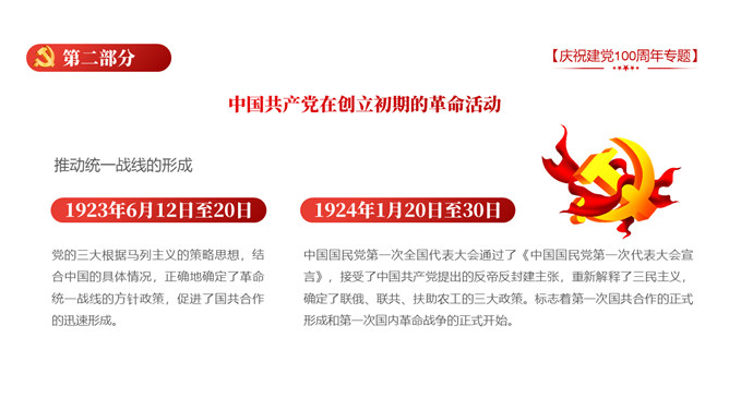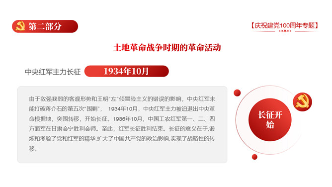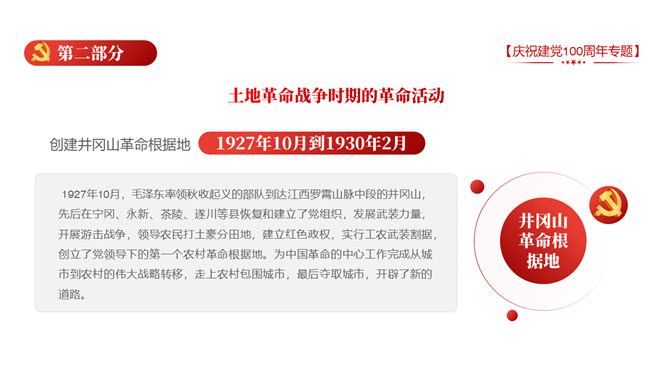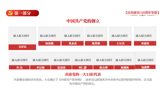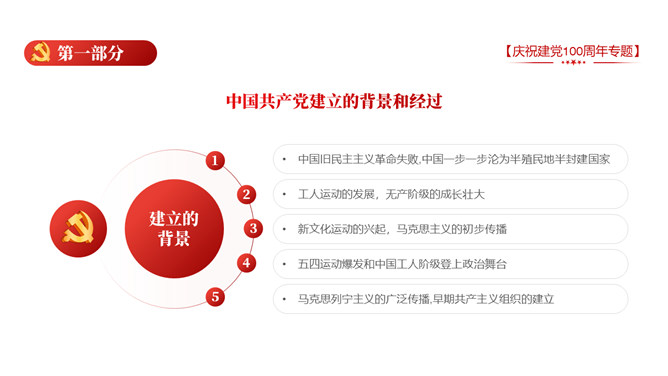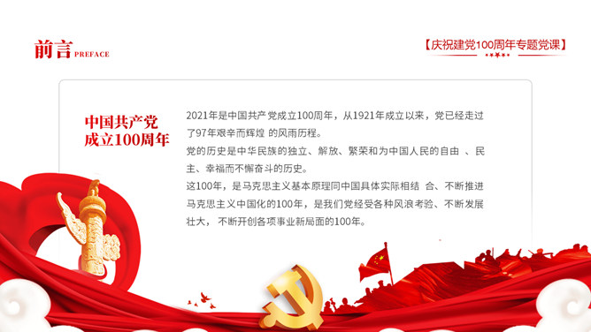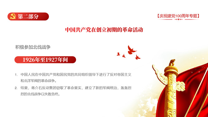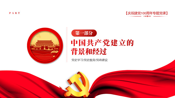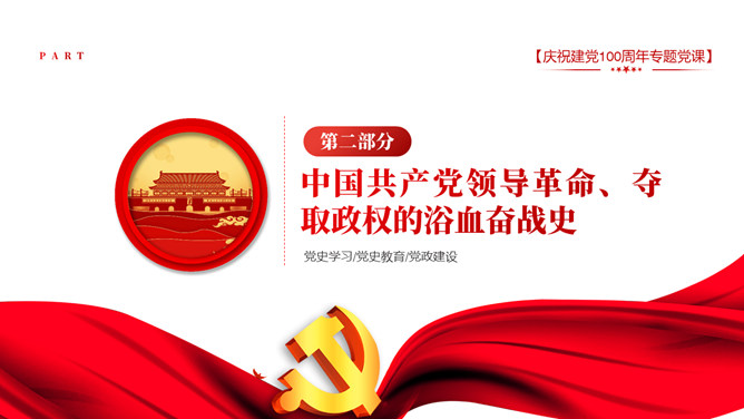 庆祝建党100周年党史学习PPT模板。一套庆祝建党百年暨党史学习主题幻灯片模板,包含中国共产党建立的背景和通过、领导革新和攫取政权的浴血奋战史、掌握政权的前史。