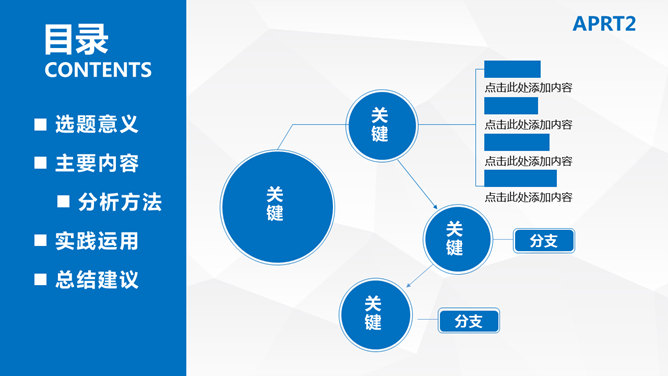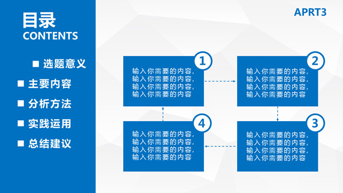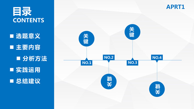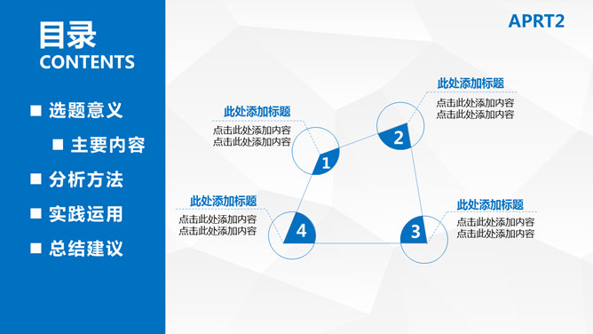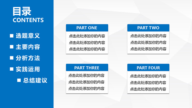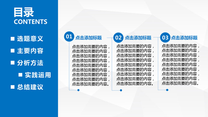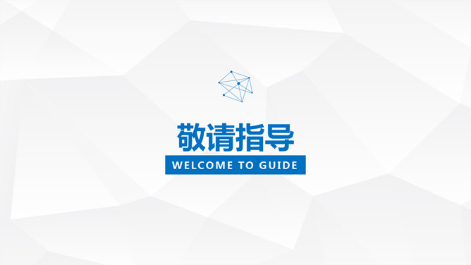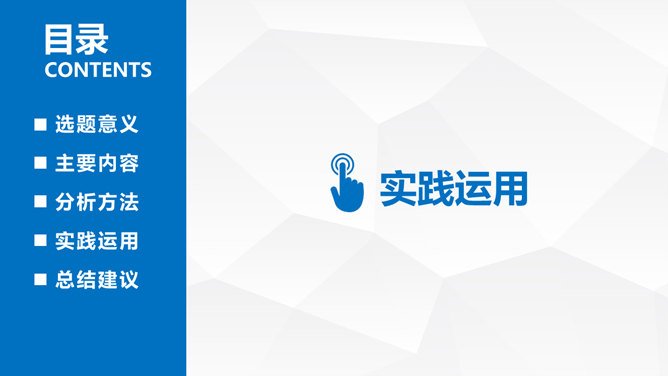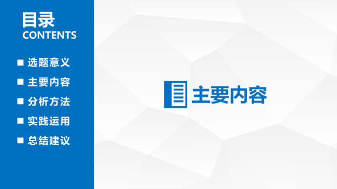 简练侧边导航学术PPT模板。一份简练清新的学术陈述类幻灯片模板,浅灰色低面多边形布景,蓝色主色调,合适开题陈述、论文答辩等用处。