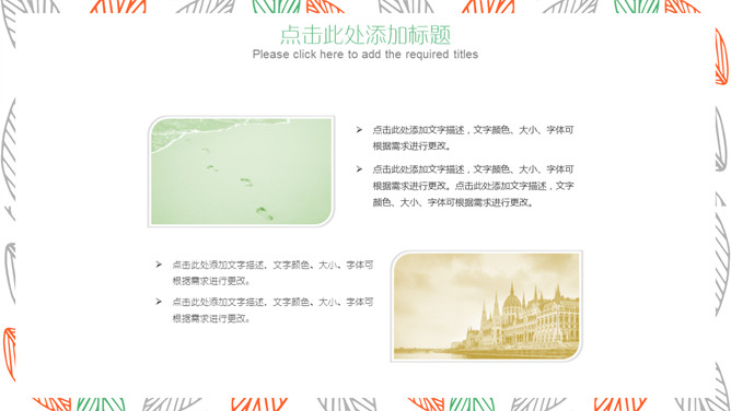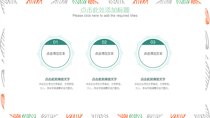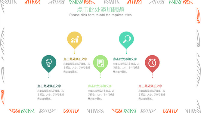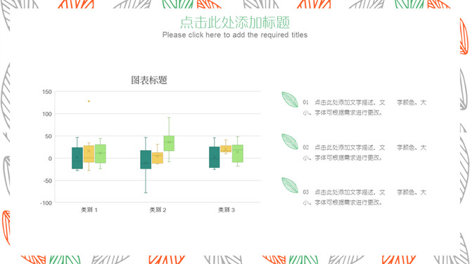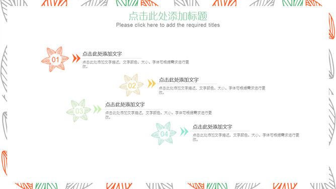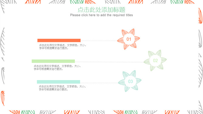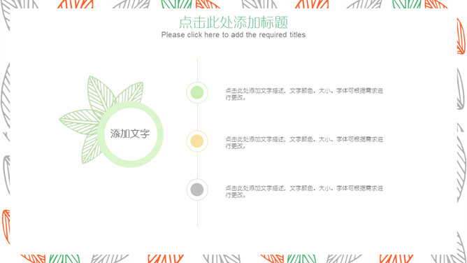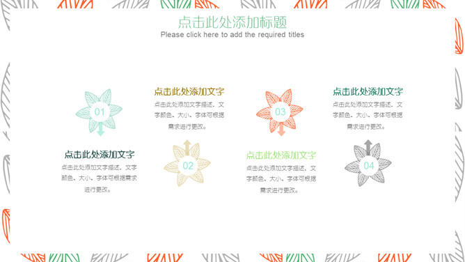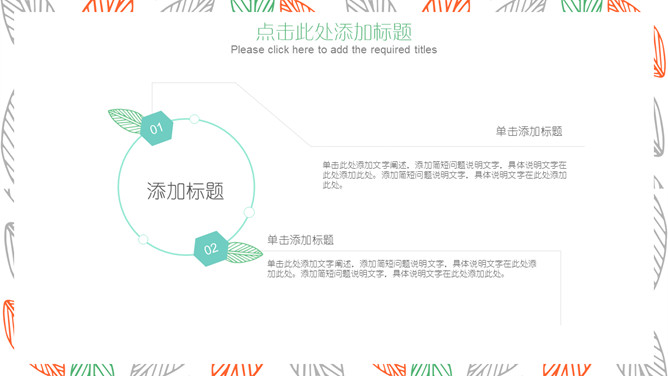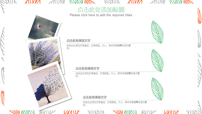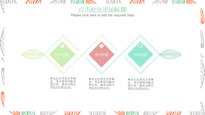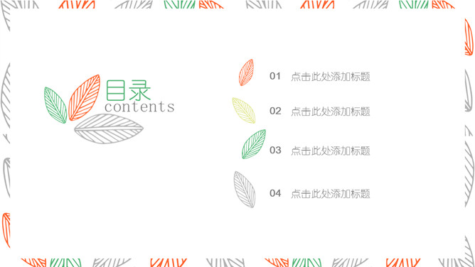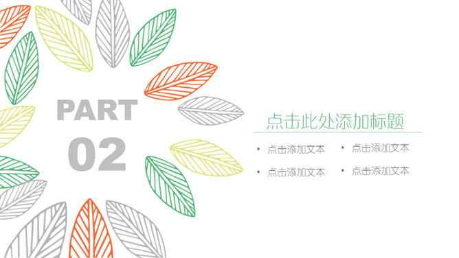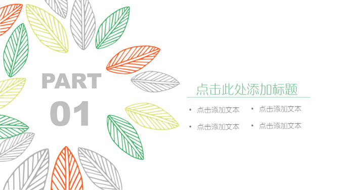 简练小新鲜五颜六色叶子PPT模板。一套唯美小新鲜幻灯片模板,精约规划,小叶子主元素,多彩配色,动态播放作用。
