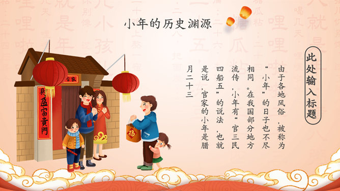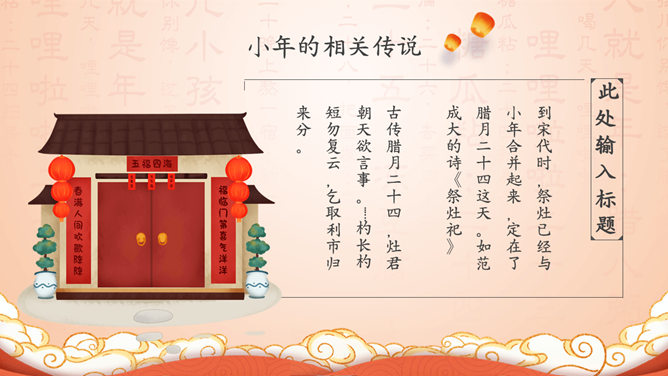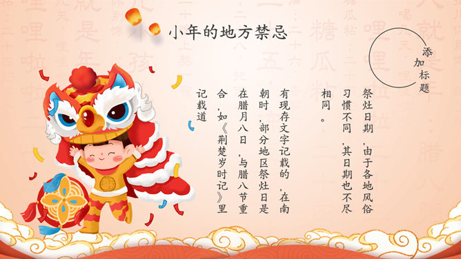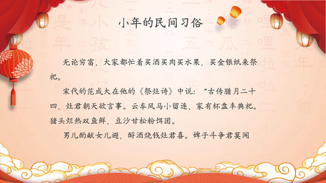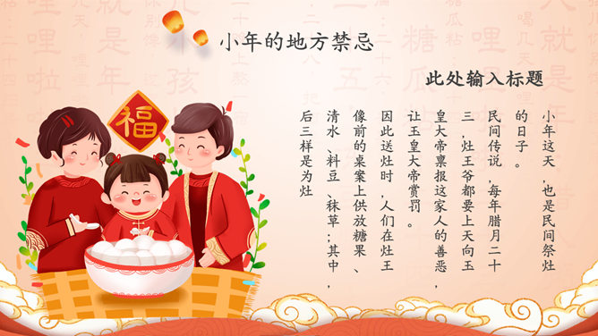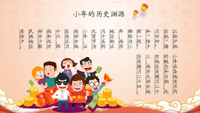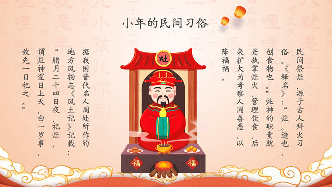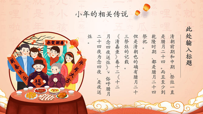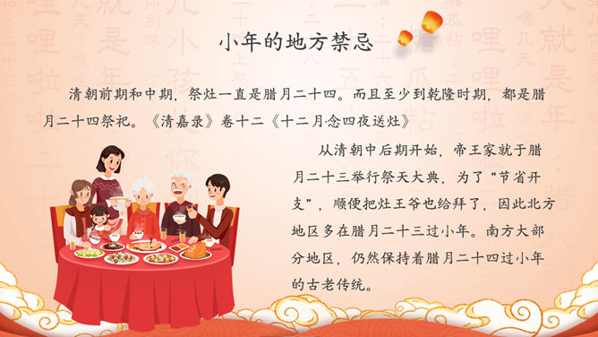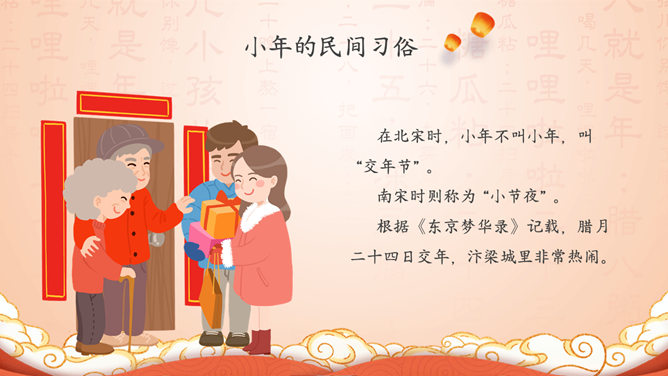 过小年习俗来历PPT模板。小年的历史渊源、小年的民间习俗、小年的当地忌讳、小年的相关传说。