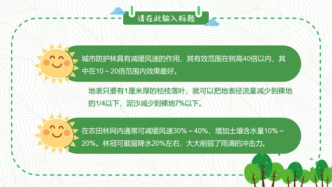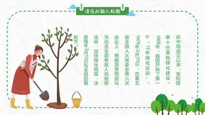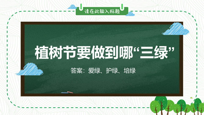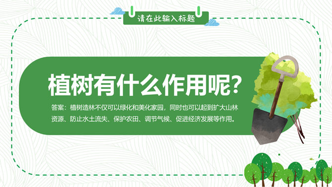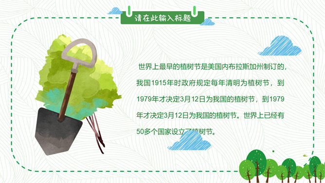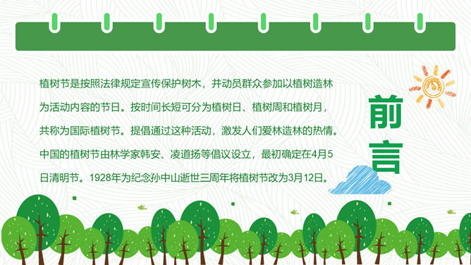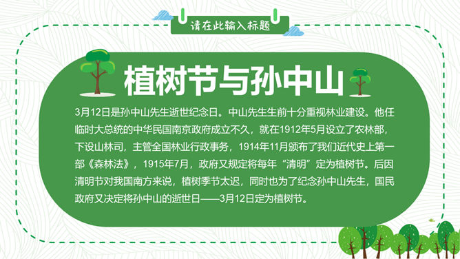 卡通植树节班会PPT模板。包括植树节的历史、由来和效果,植树节与孙中山,知识竞答环节,宣传标语等内容。