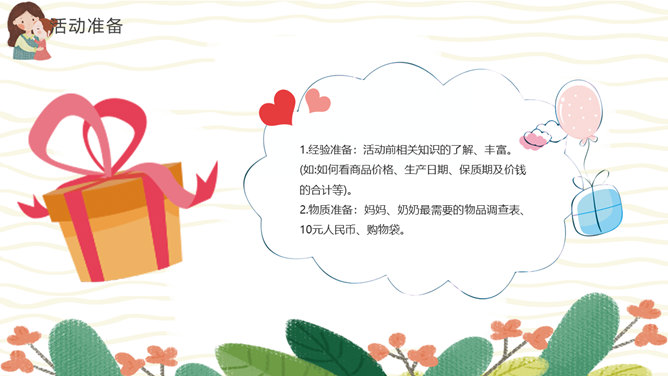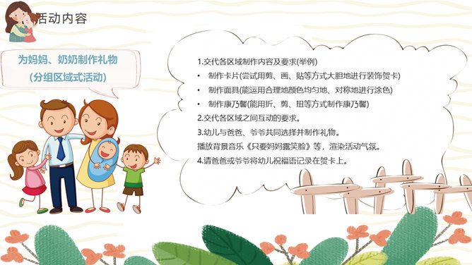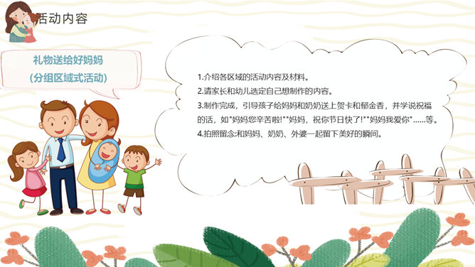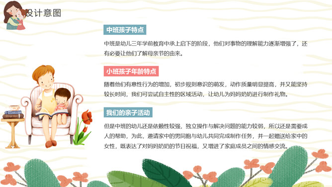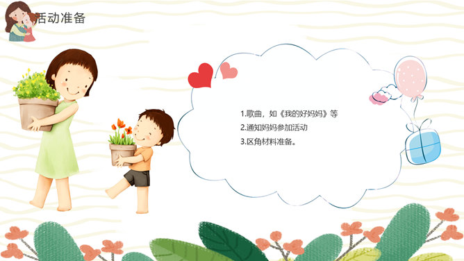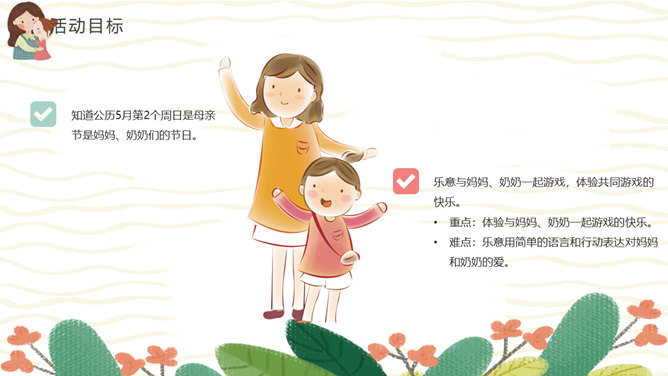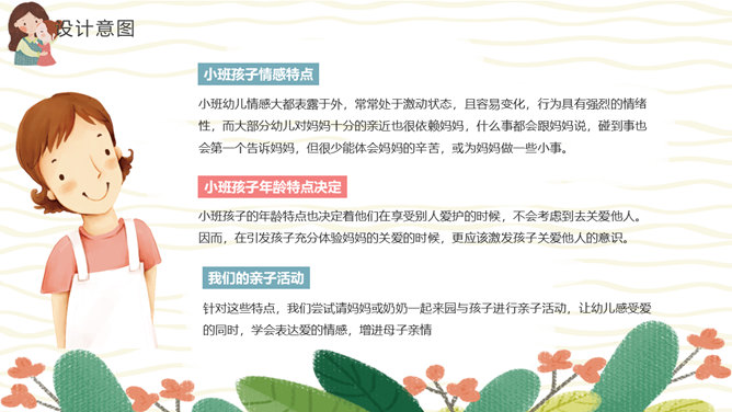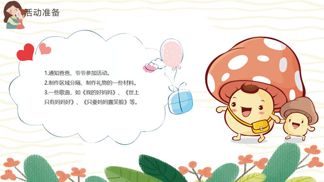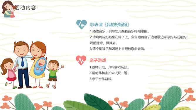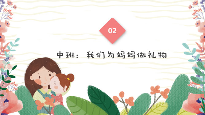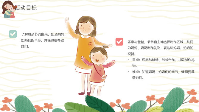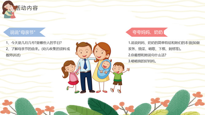 卡通母亲节主题班会PPT模板。一套母亲节主题幻灯片模板,心爱卡通风格设计,叶子花朵装修,合适母亲节班会活动。