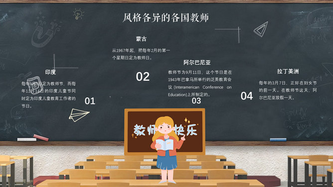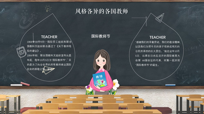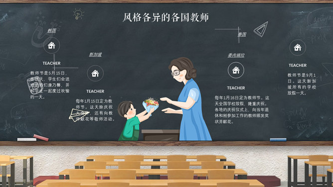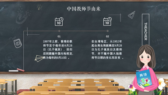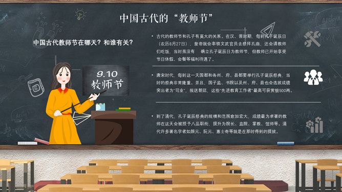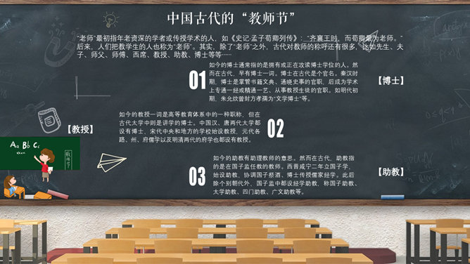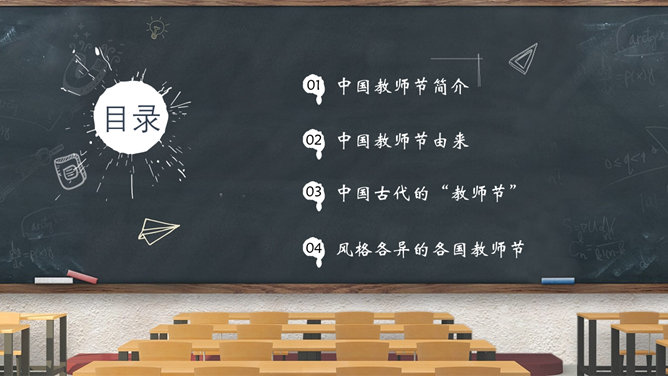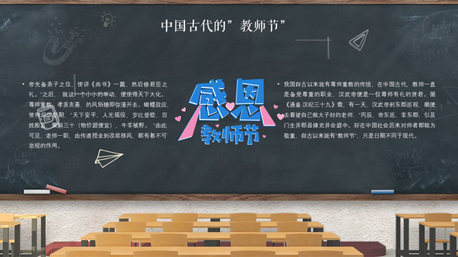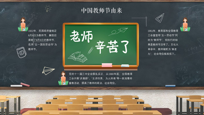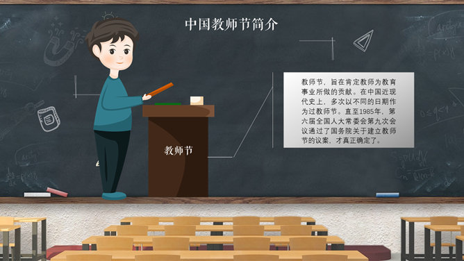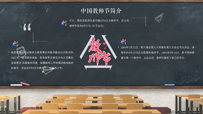 教室黑板教师节PPT模板。一套庆祝教师节主题幻灯片模板,教室黑板资料规划,适合感恩老师教育培养等内容。