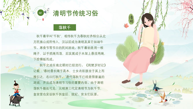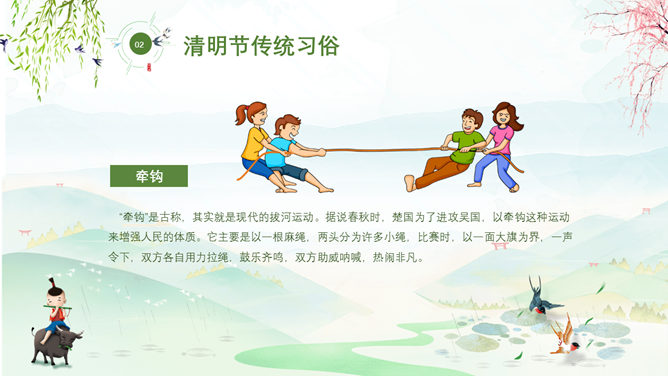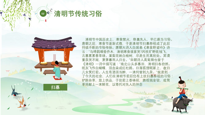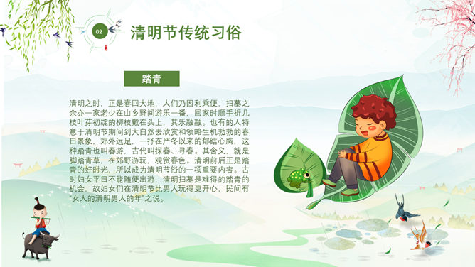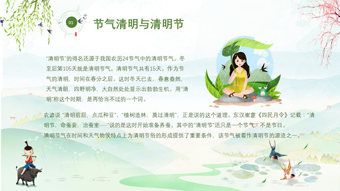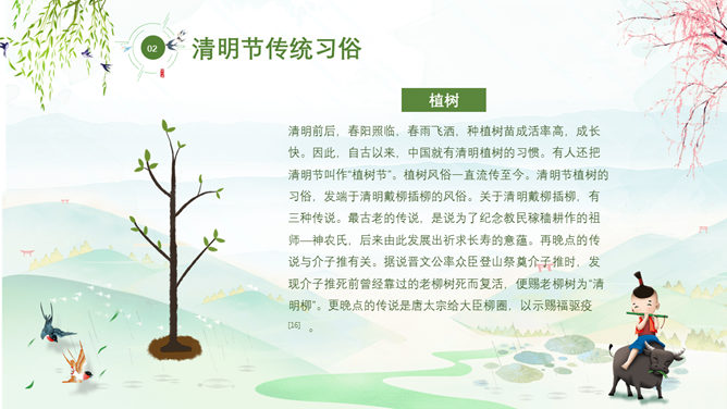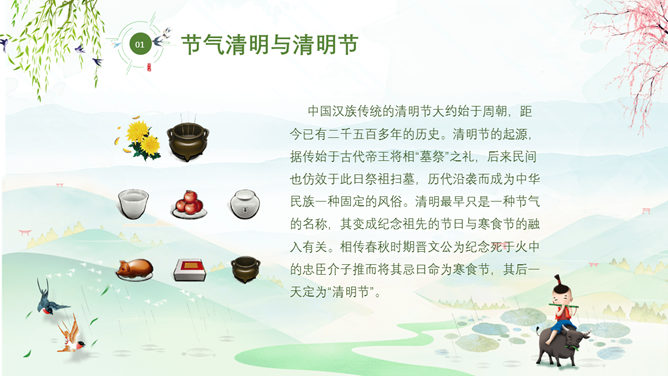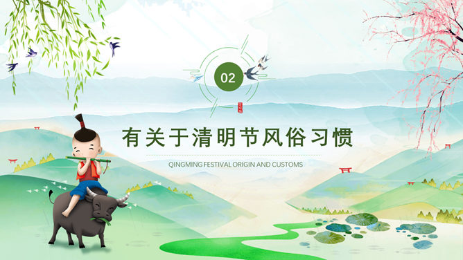 牧童清明节风俗介绍PPT模板。一套清明节来源前史、风俗介绍幻灯片模板,可爱卡通牧童、春天背景,动态播映效果。