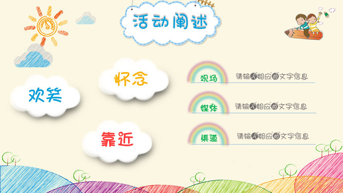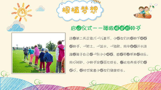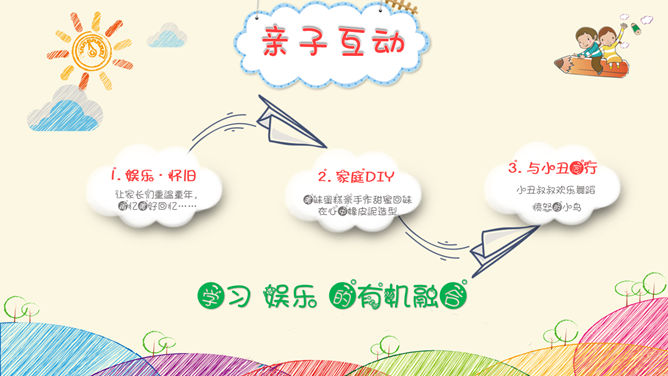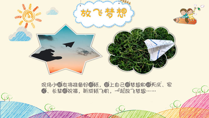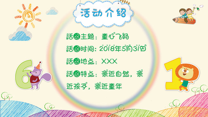 缤纷五颜六色六一儿童节PPT模板。一套儿童节主题幻灯片模板,心爱卡通规划风格,五颜六色蜡笔绘制,多图文排版。运用字体:汉仪乐喵体W、Aa双鱼座。