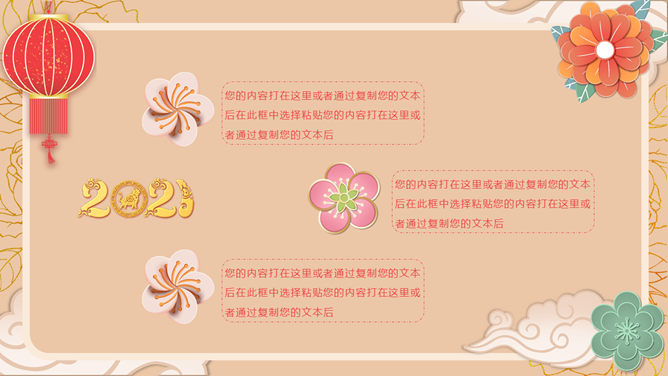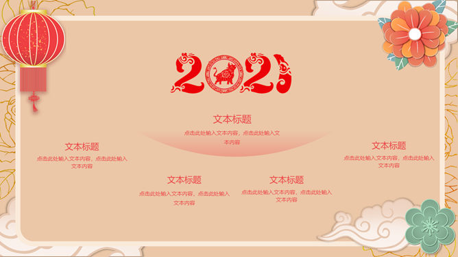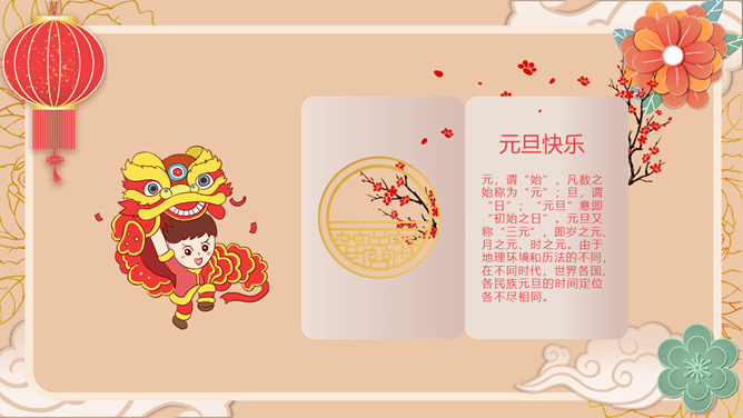 大红灯笼喜庆元旦PPT模板。一套元旦主题模板,喜庆中国风规划,大红灯笼、花朵元素,合适元旦相关内容。