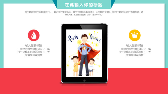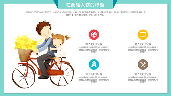 心爱卡通风父亲节PPT模板。一套父亲节主题幻灯片模板,心爱卡通设计风格。主张安装字体:方正特粗光辉简体。