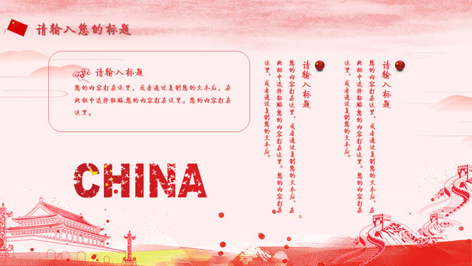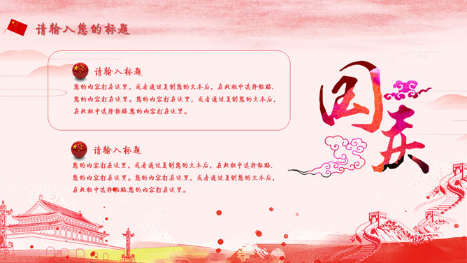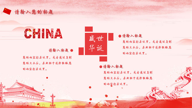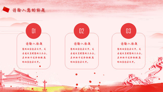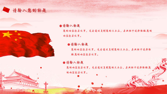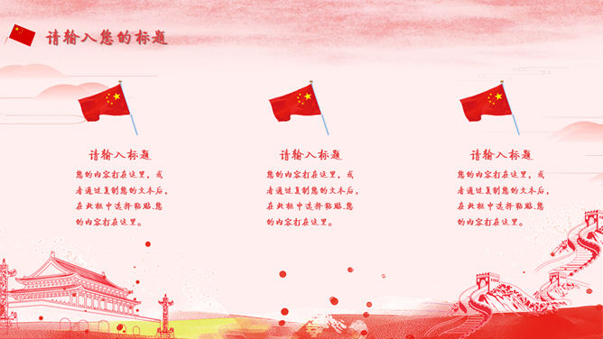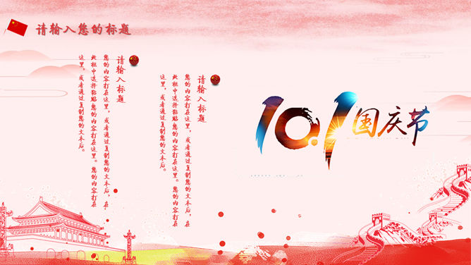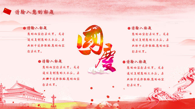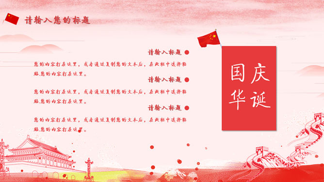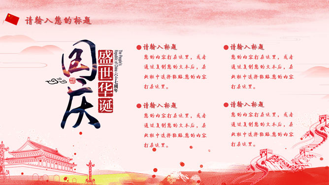 祖国万岁庆祝国庆节PPT模板。一套庆祝国庆节幻灯片模板,喜庆红色主色调,天安门、国旗、长城等元素装修。