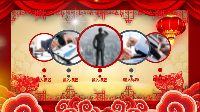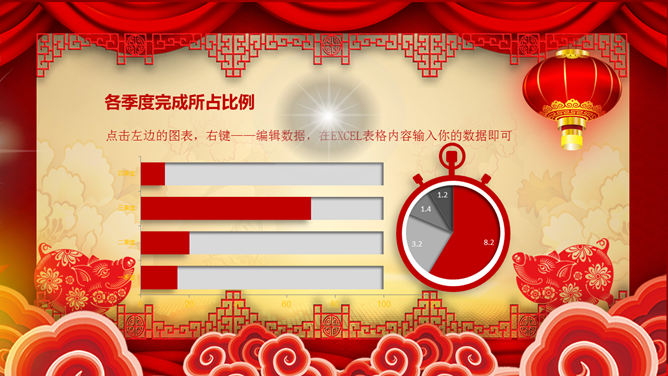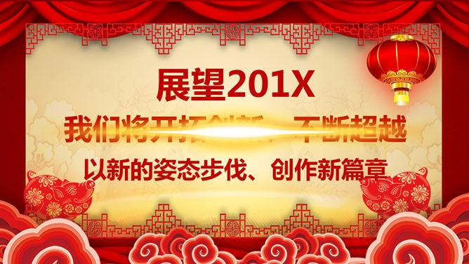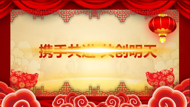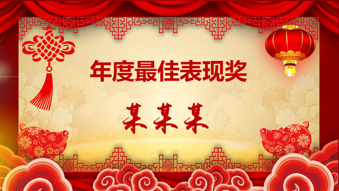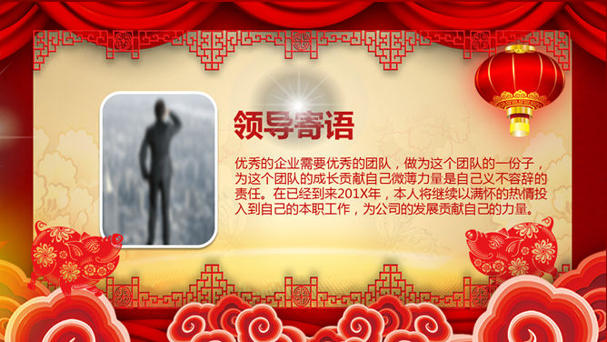 喜庆新年新年年会PPT模板。一套喜庆猪年新年公司年会幻灯片模板,包含领导致辞,效果总结,颁奖典礼几部分。