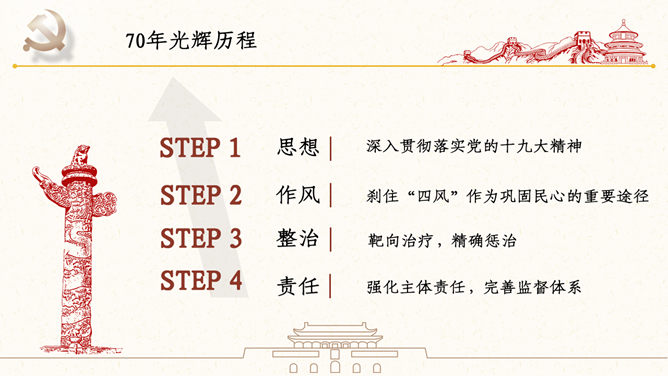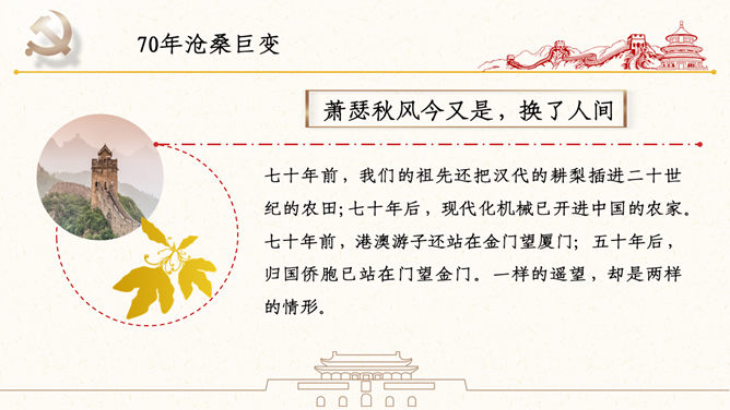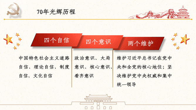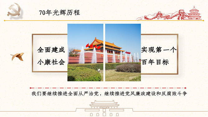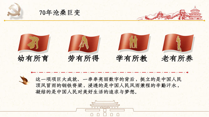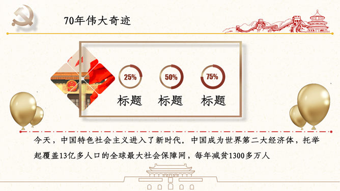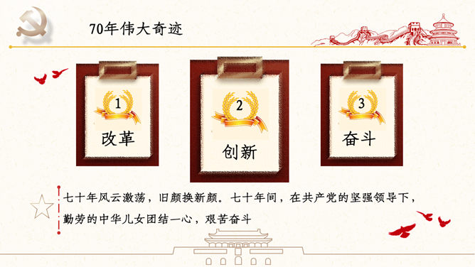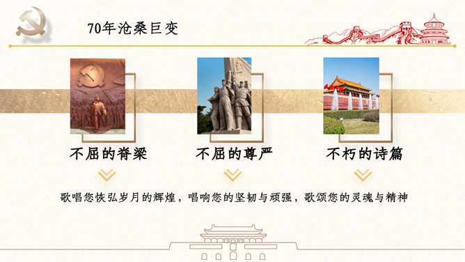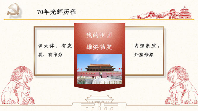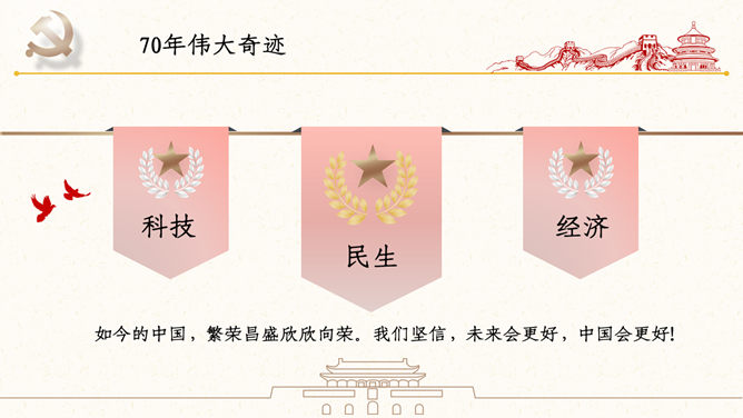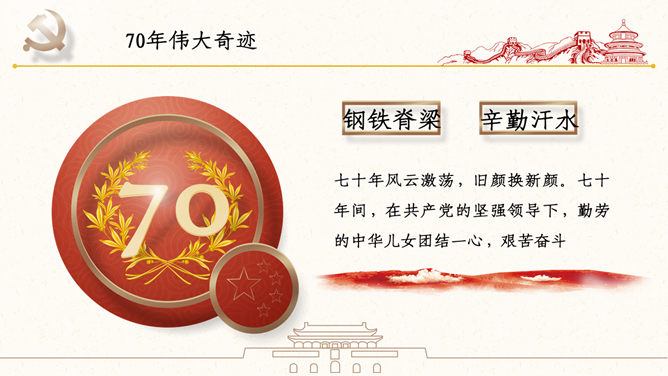 热烈庆祝建国70周年PPT模板。一套国庆70周年主题幻灯片模板,大气喜庆规划,页面类型有用丰富,规划精巧。