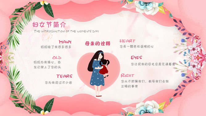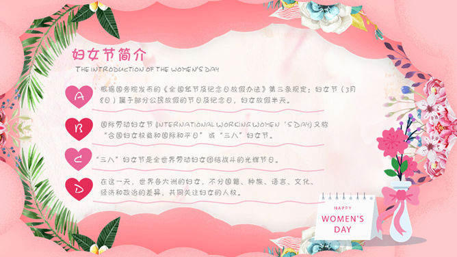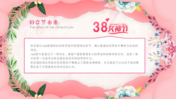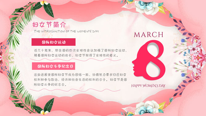 三八妇女节女神节PPT模板。一套三八妇女节主题幻灯片模板,女神专属粉色配色,花朵花边装饰,合适活动策划等。