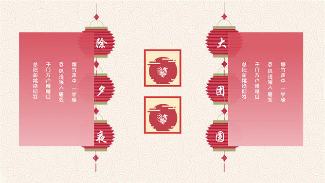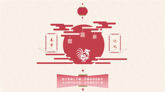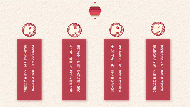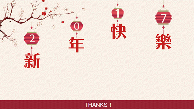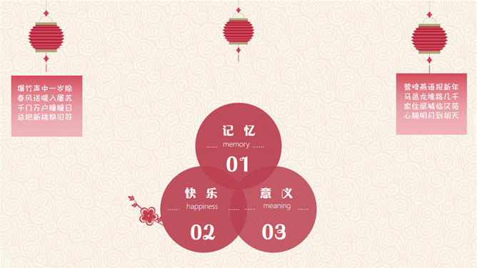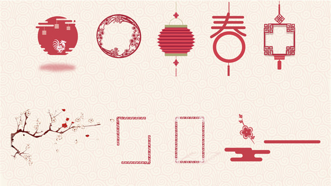喜庆新年新年快乐PPT模板。一套农历新年新年主题幻灯片模板,喜庆赤色主色,灯笼、梅花、祥云等传统元素规划。运用字体:方正粗活意繁体、MEllan PRC Xbold、MComic PRC Medium、MGentle PRC Xbold、华文行楷。