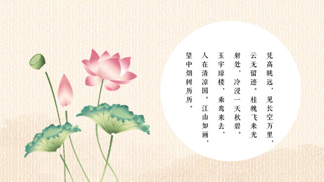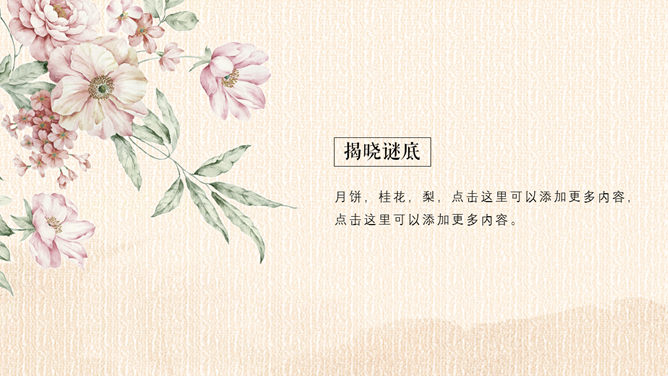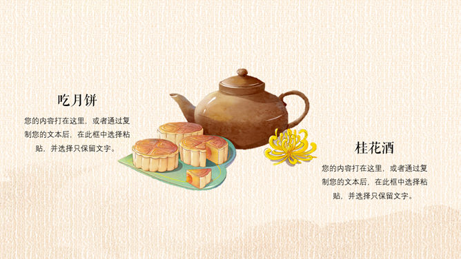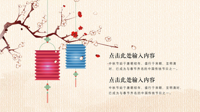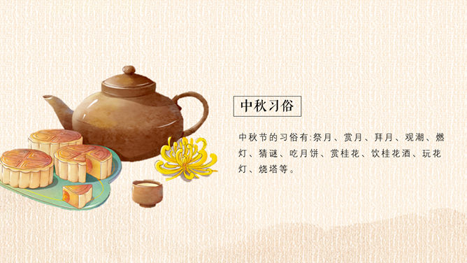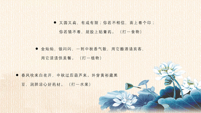精巧古典中秋佳节PPT模板。一套设计精巧的中秋节主题幻灯片模板,月亮、月饼、荷花灯古典元素装饰。