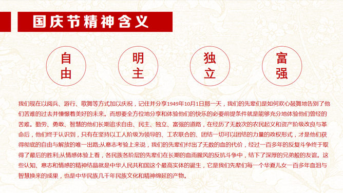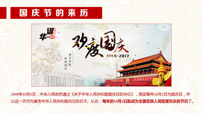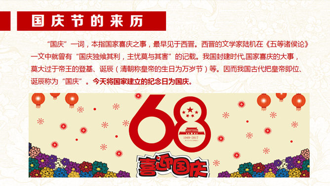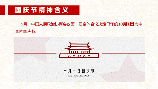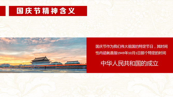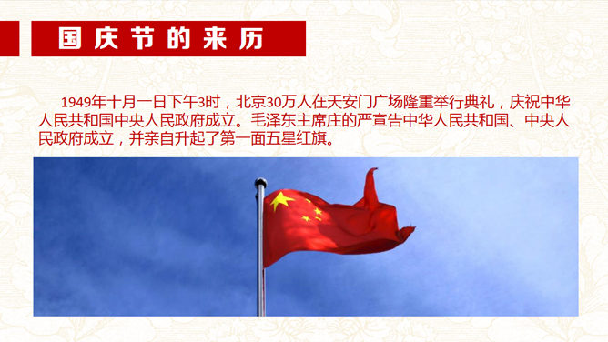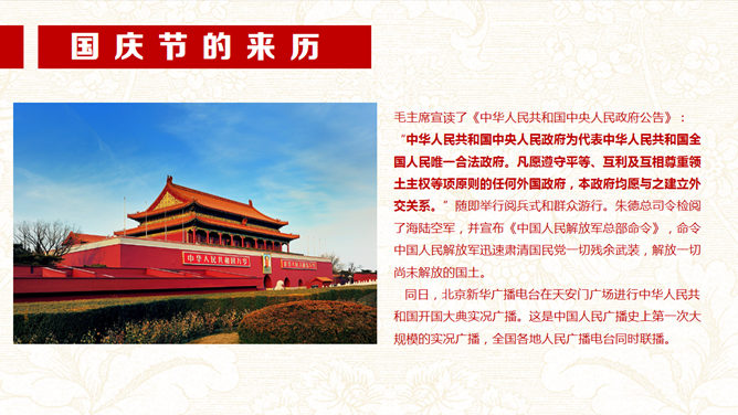 喜迎国庆节PPT模板下载。一套国庆节主题幻灯片模板,大气喜庆赤色主色调,图文排版为主,动态播映。