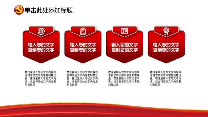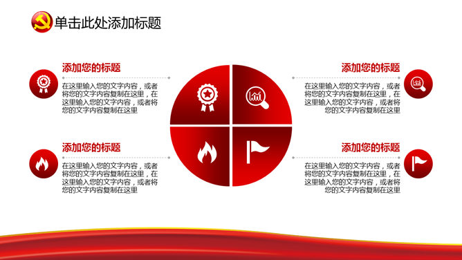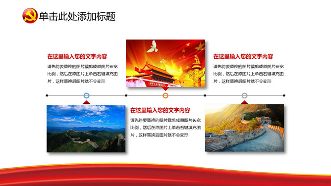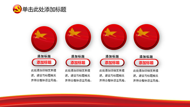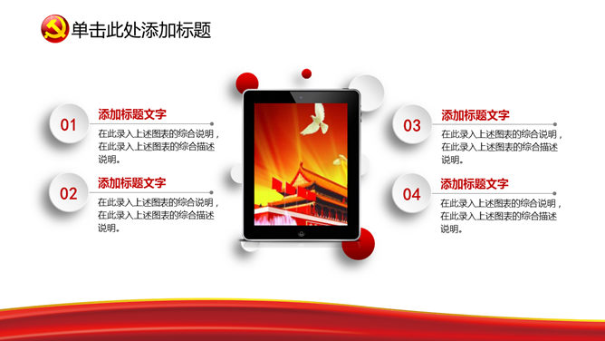 一份设计精美的建党节主题幻灯片模板,美丽的动态播映作用,页面类型丰厚。关键词:国旗 党徽 天坛 建党节PPT模板。