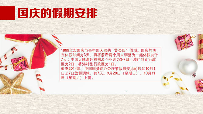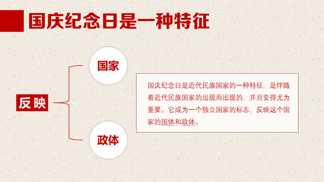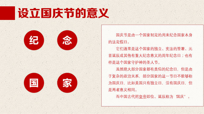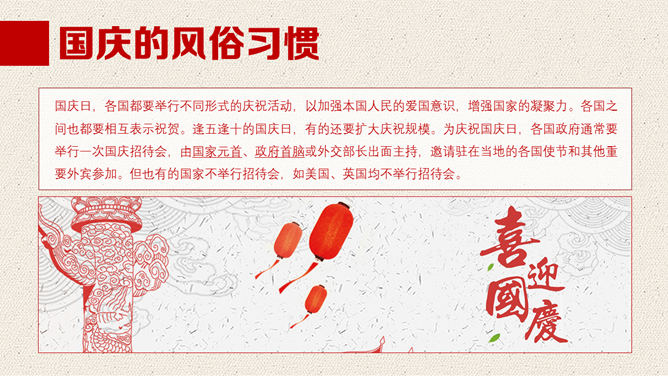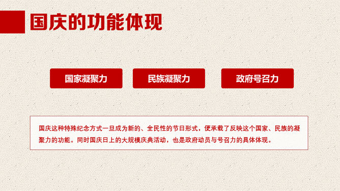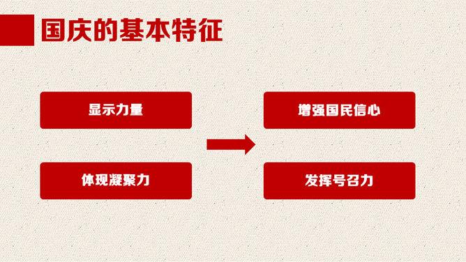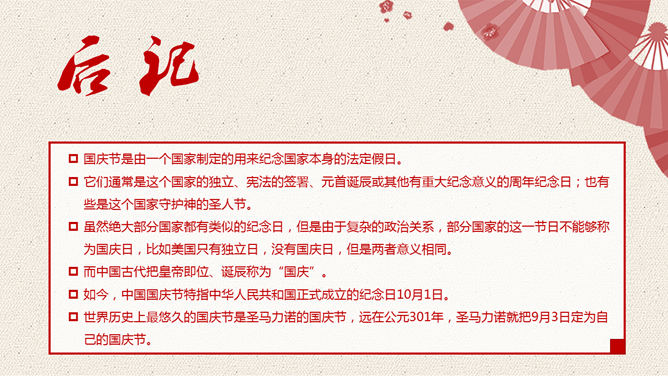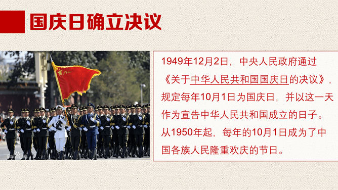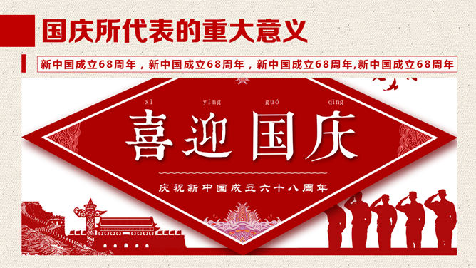 一份精美的国庆节PPT模板,以飘扬的国旗、天安门、华表、国徽、长城为背景,恢弘庄重大气,共23页,动态播映作用。