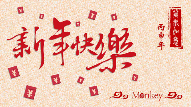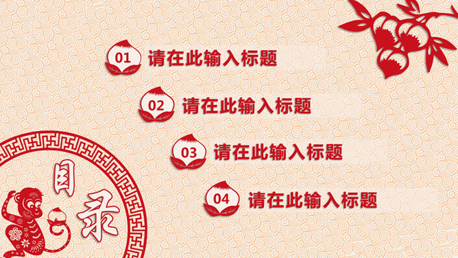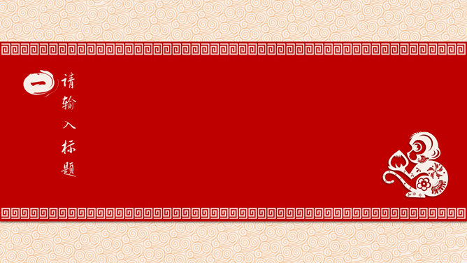 构思剪纸喜庆猴年PPT模板。一份猴年主题幻灯片模板,构思剪纸效果设计,吉祥云纹背景,兴旺喜庆,动态播映。
