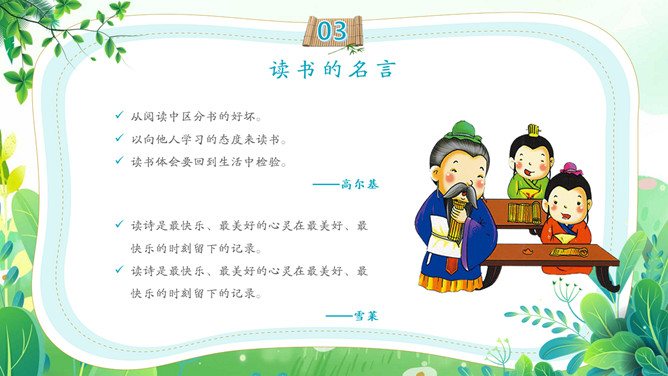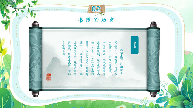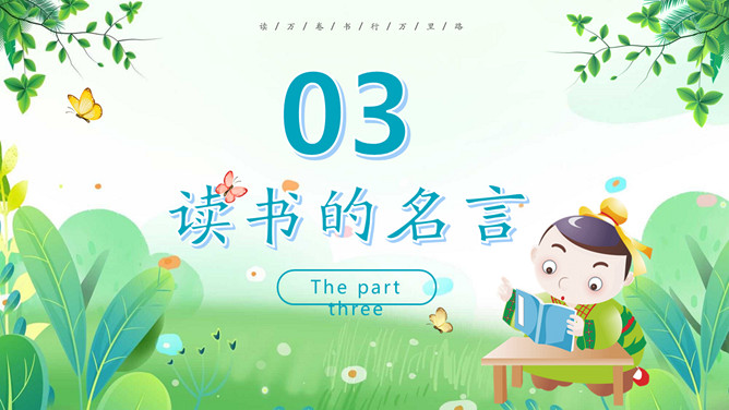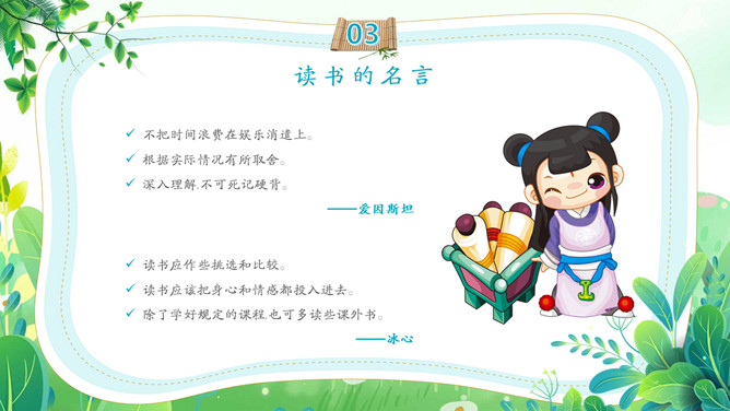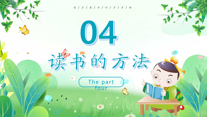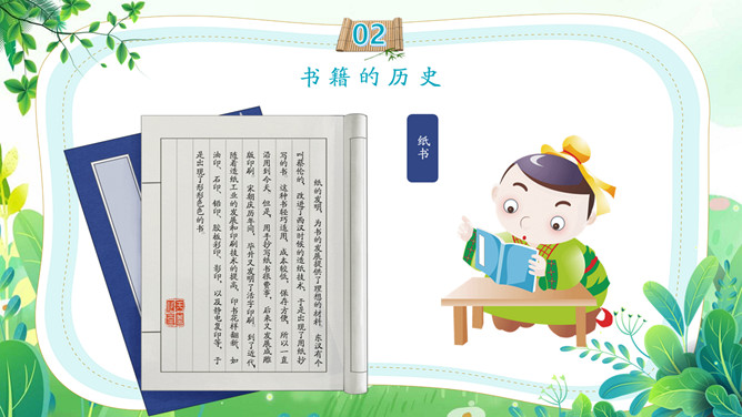 卡通古风国际读书日PPT模板。一套国际读书日主题幻灯片模板,心爱卡通古风规划,介绍了书本的前史、读书的名言和读书的方法等内容。