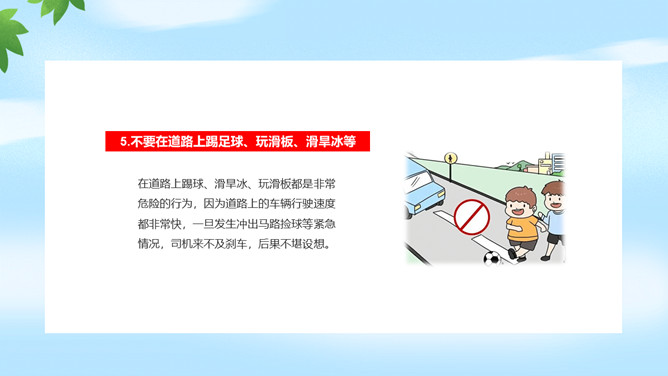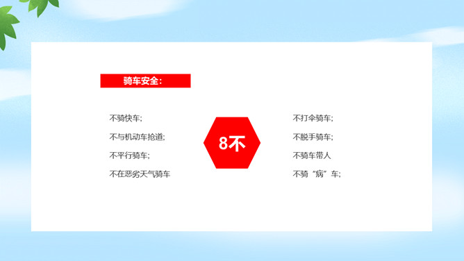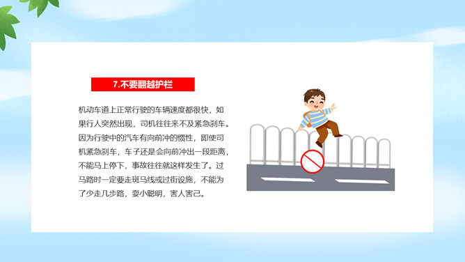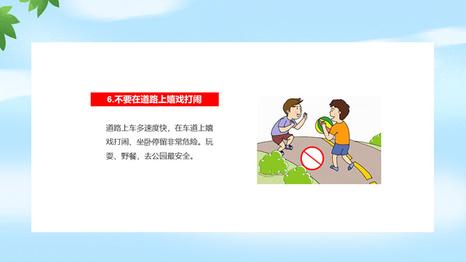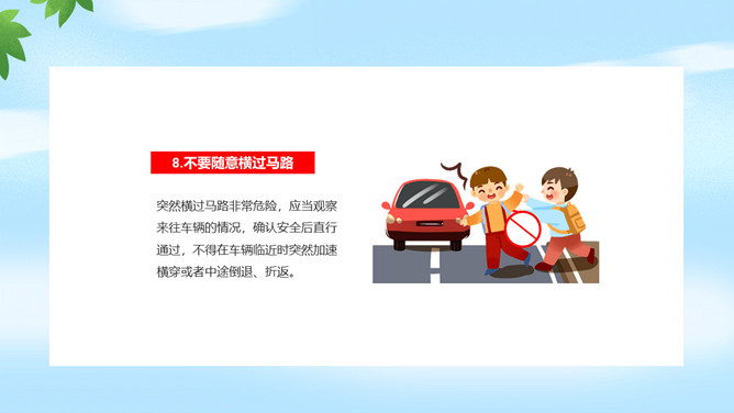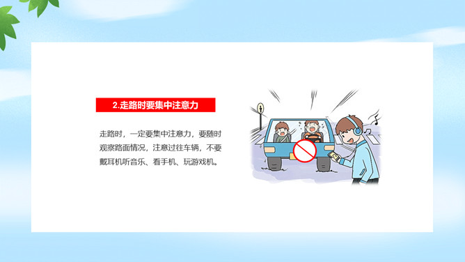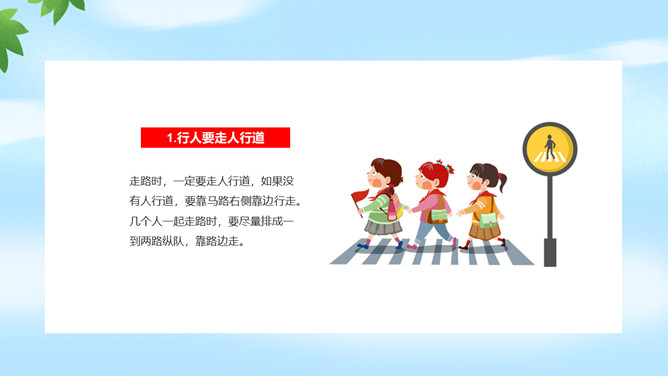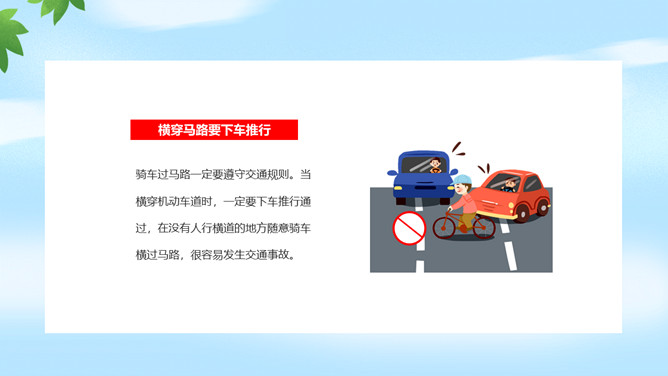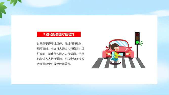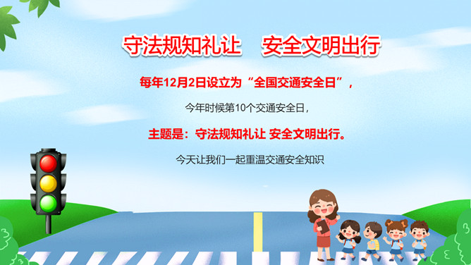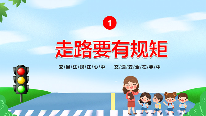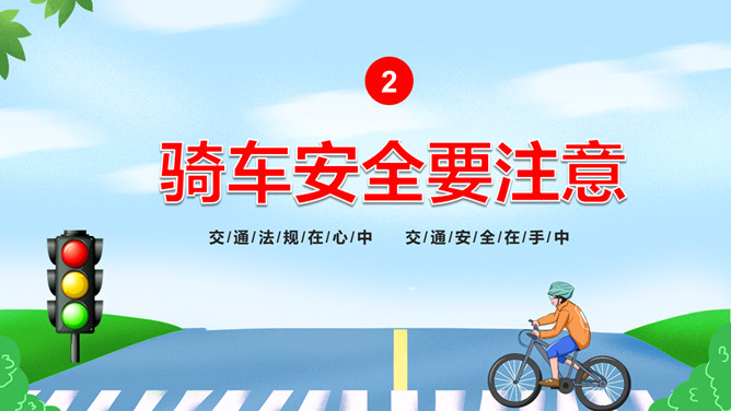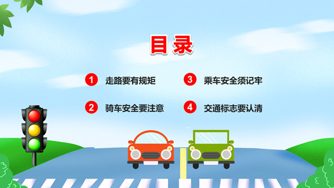 全国交通安全日交通安全教育PPT模板。目录:走路要有规矩、骑车安全要注意、乘车安全须记牢、交通标志要认清。
