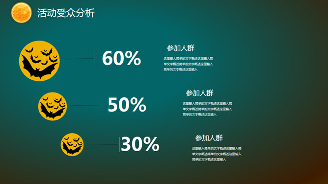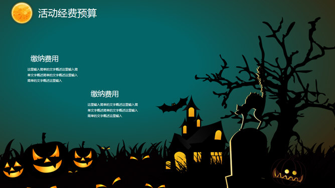 这是一份万圣节主题的幻灯片模板。紫色的万圣节的夜晚,奇形怪状的大树,描绘出了恐惧的气氛,内页包含以蝙蝠、蜘蛛网、怪树形状的图形。适合制造与万圣节相关的PPT。
