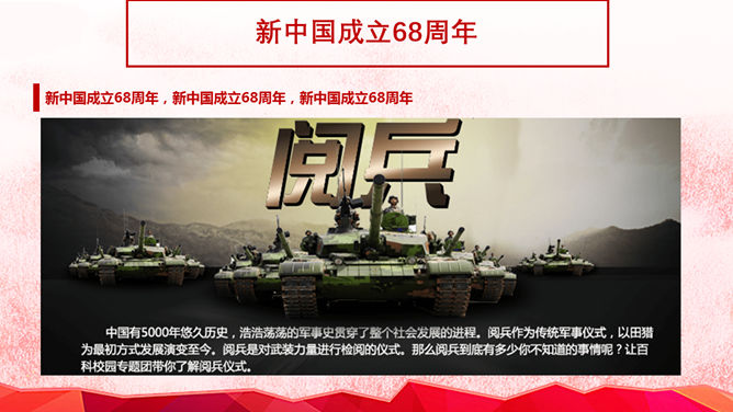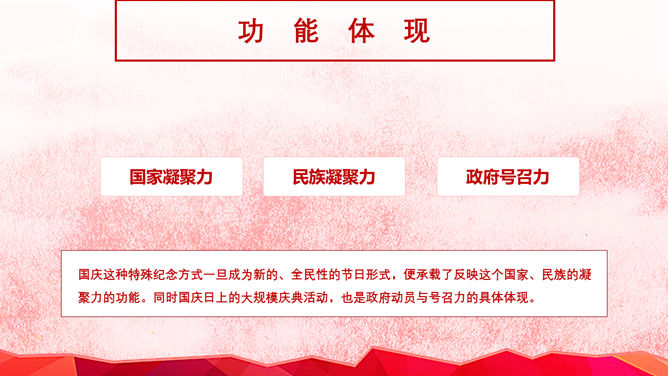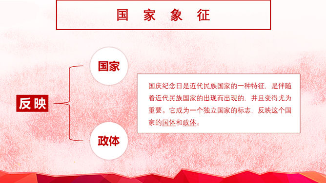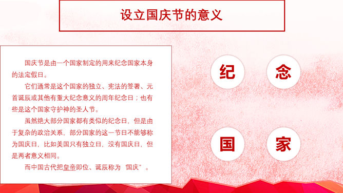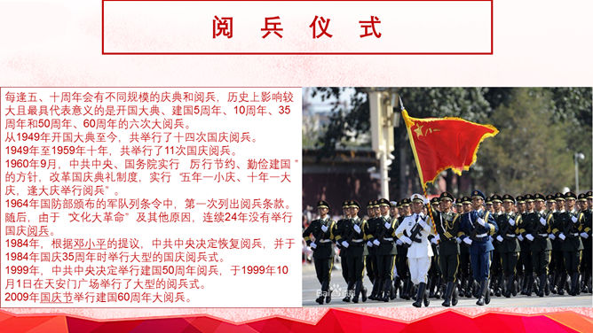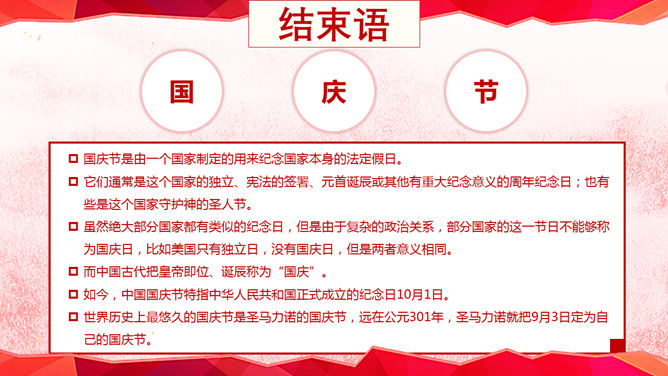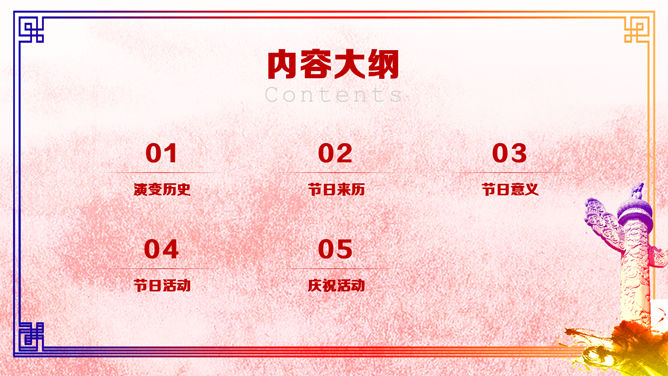 这是一份大气的幻灯片模板,以华表、天安门为背景元素,红色的主色调,烘托出喜庆的节日气氛,合适庆祝国庆节活动使用,共22页,包含多种页面。