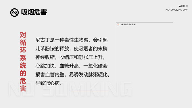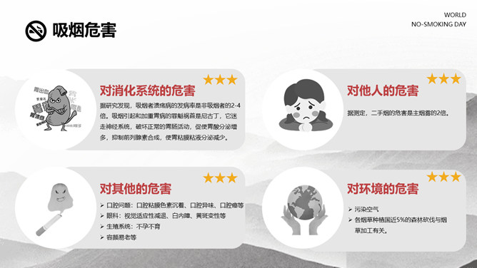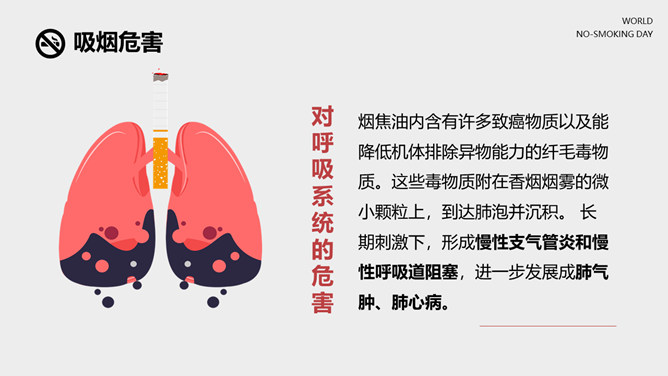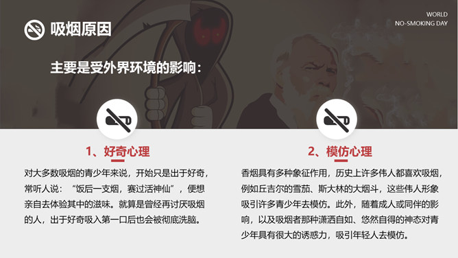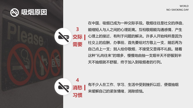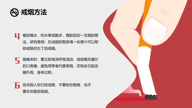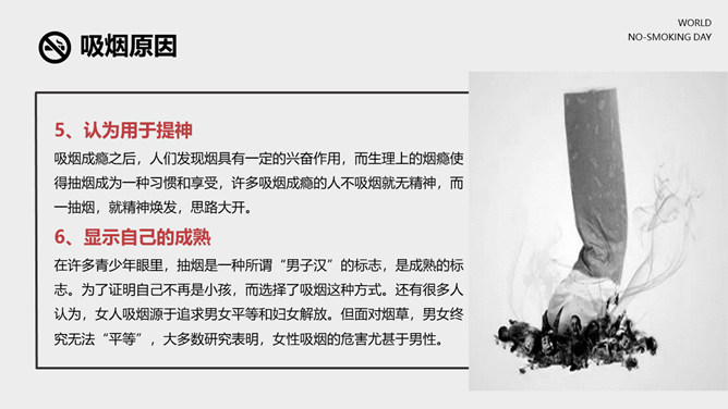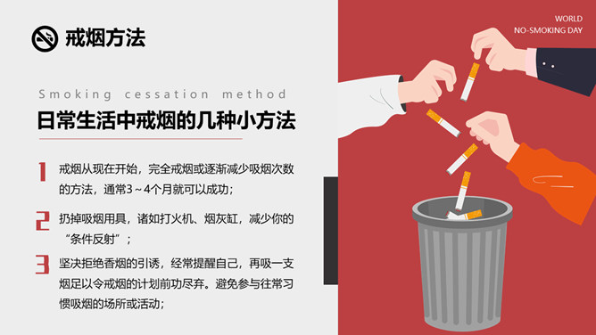 戒烟国际无烟日PPT模板。一套国际无烟日幻灯片模板,国际无烟日的来历和主题、吸烟的危害和原因、简略的戒烟办法。
