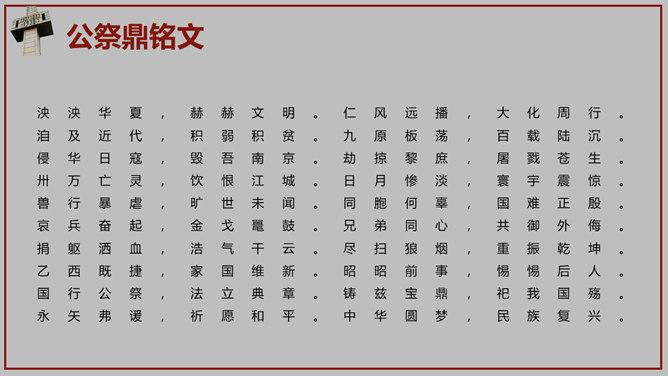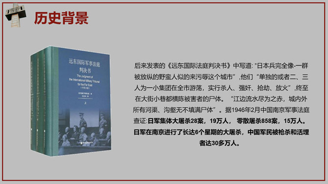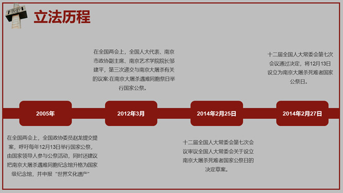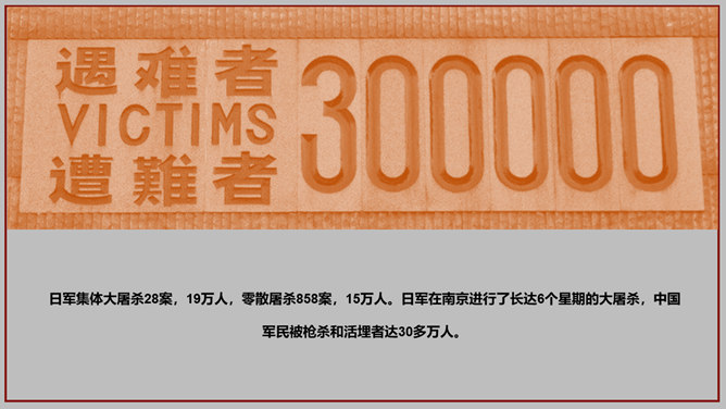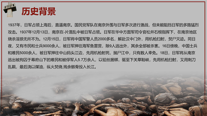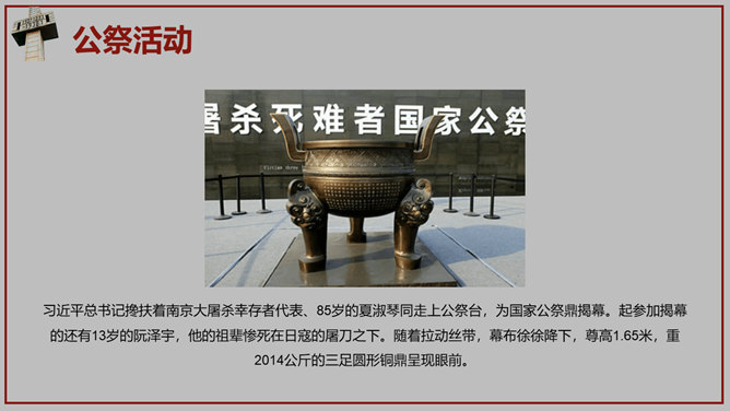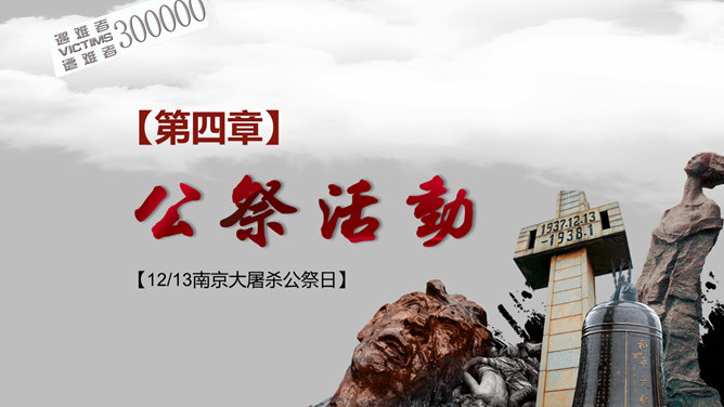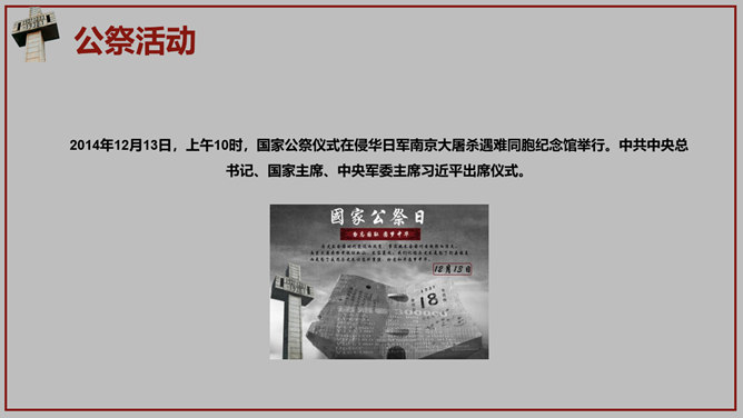 南京大屠杀国家公祭日PPT模板。一套国家公祭日主题模板,包含历史背景、罪恶行径、立法历程、公祭活动、重大意义。