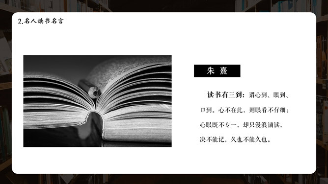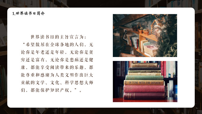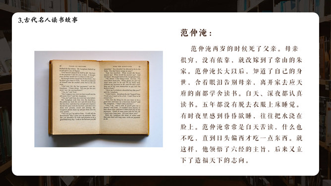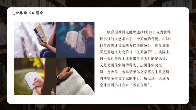 书籍图书国际读书日PPT模板。国际读书日简介、名人读书名言、古代名人读书故事、名人读书方法、读书知识问答。