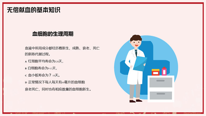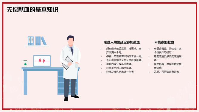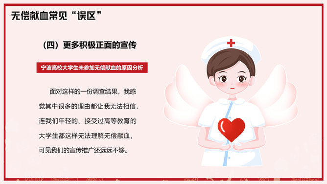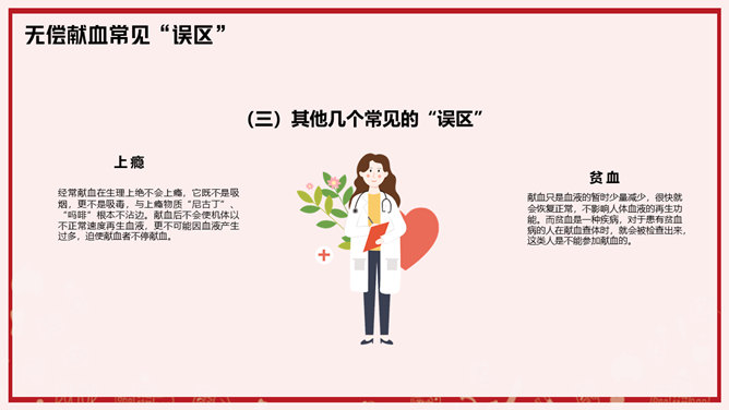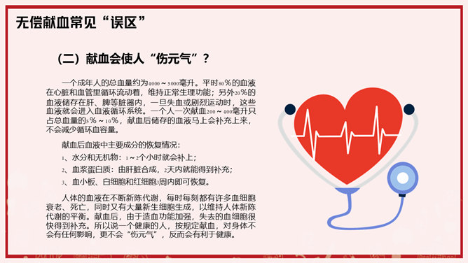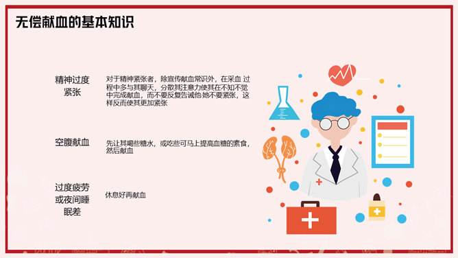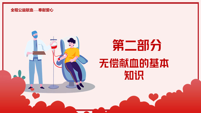 无偿献血国际献血日PPT模板。无偿公益献血常见“误区”和基本知识、献血优点、献血流程、正规的献血途径。