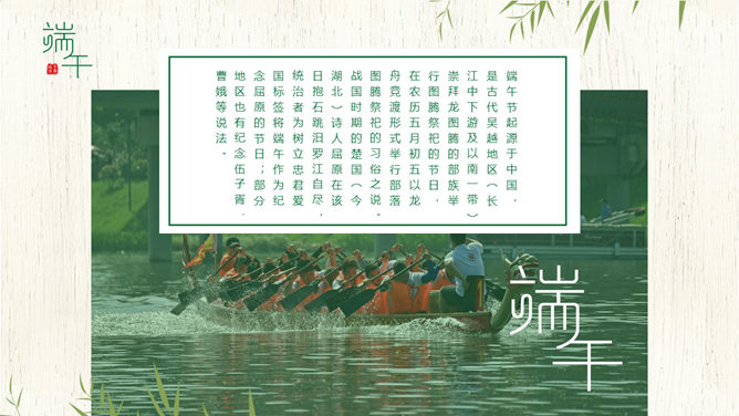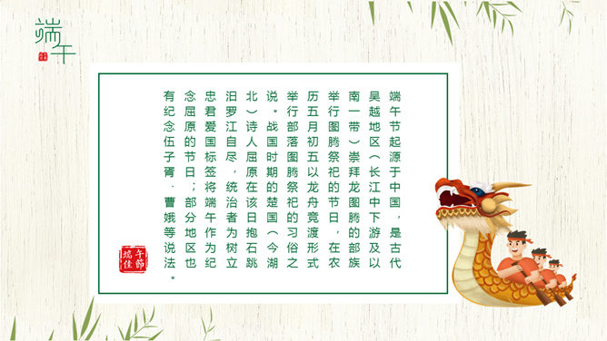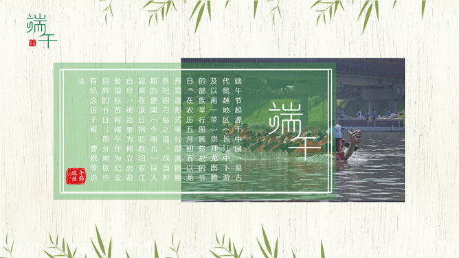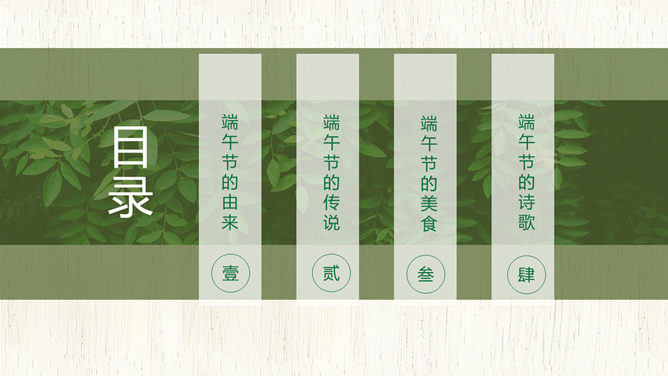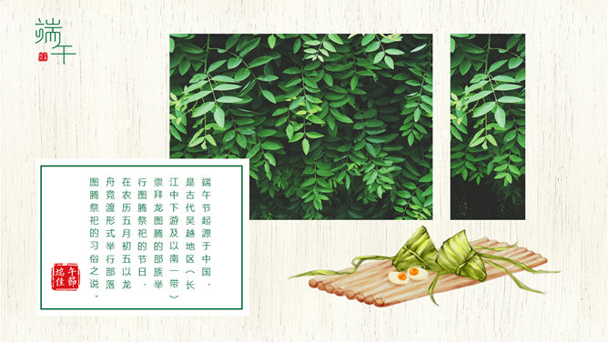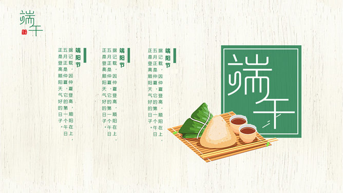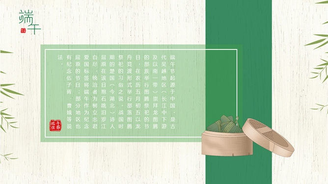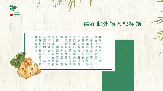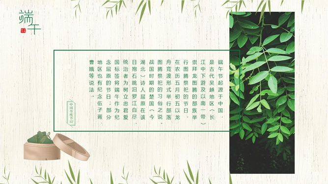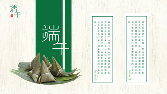 竹叶粽子清新端午节PPT模板。一套端午节主题幻灯片模板,木纹背景,粽子、竹叶装修,清新自然。