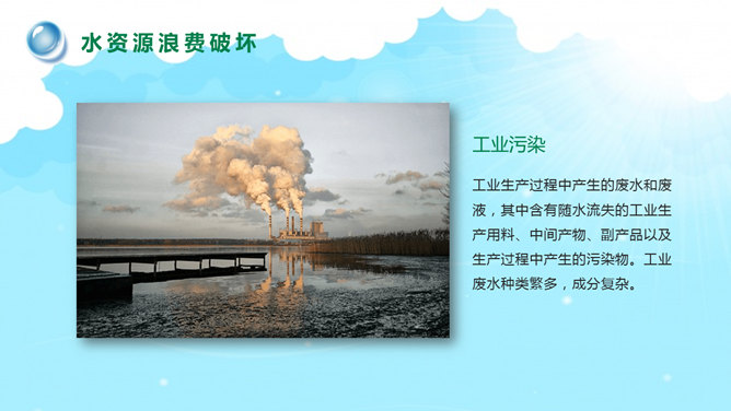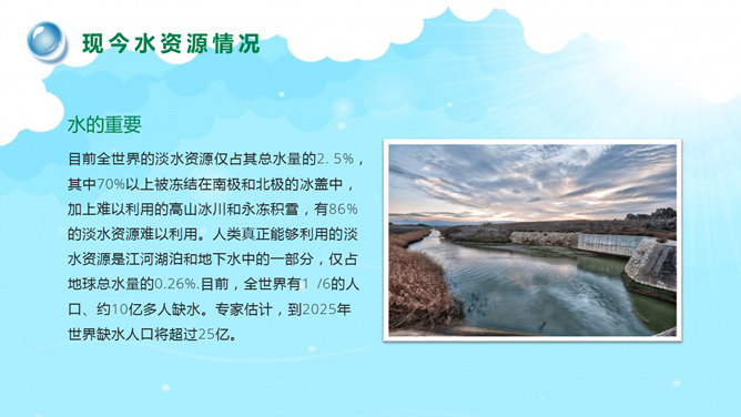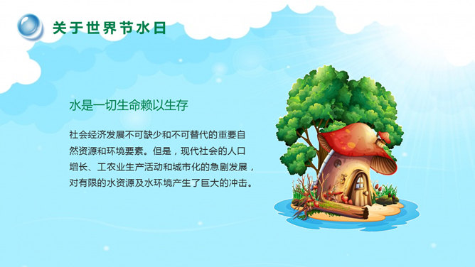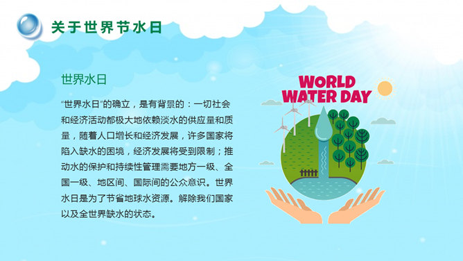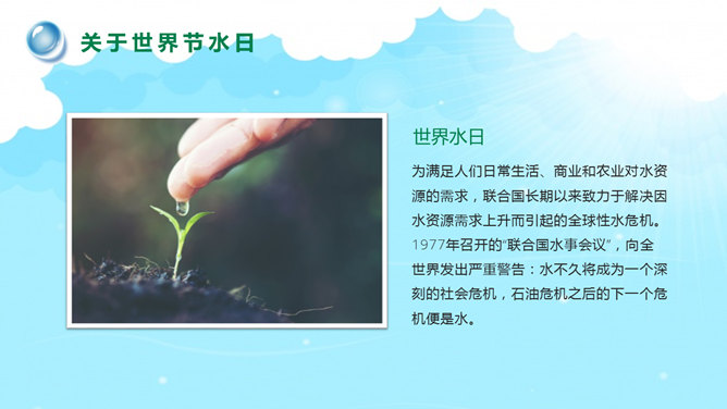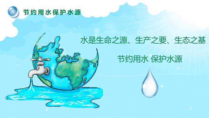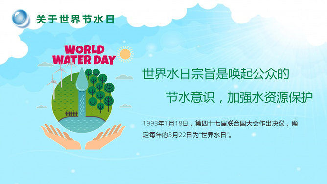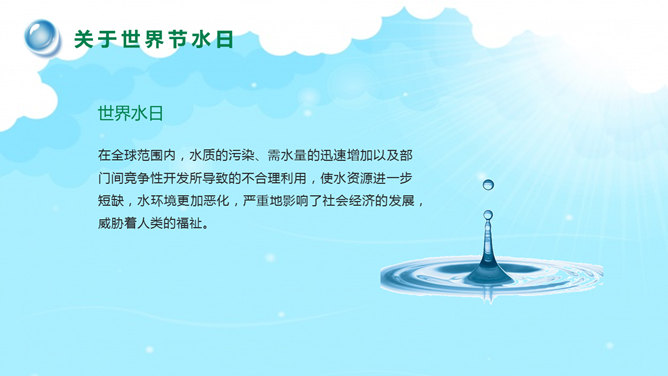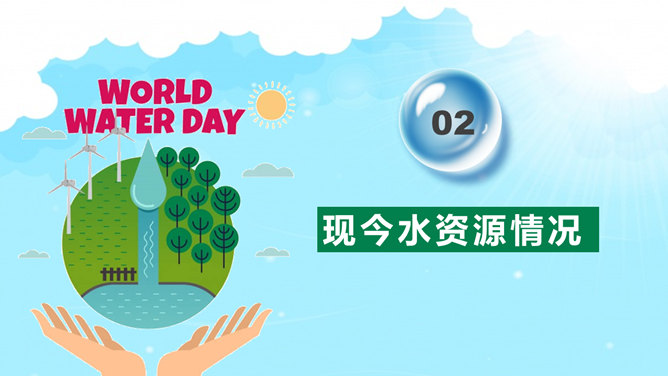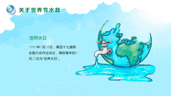 国际水日主题班会PPT模板。一套国际水日主题班会幻灯片模板,包括关于国际节水日、如今水资源状况、水资源糟蹋破坏、节约用水保护水源等部分。建议安装字体:庞门正道标题体。