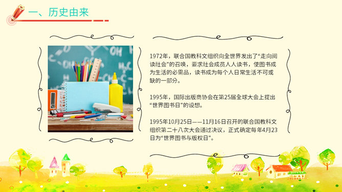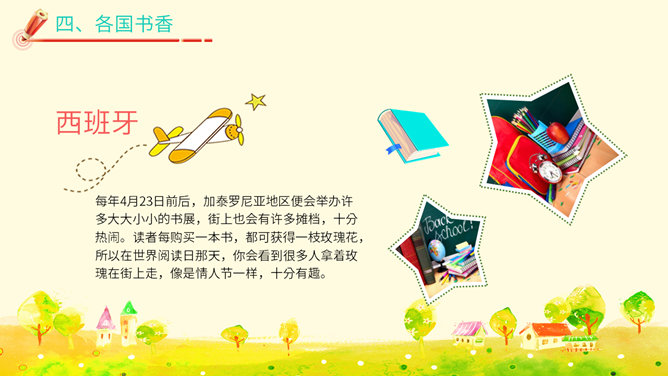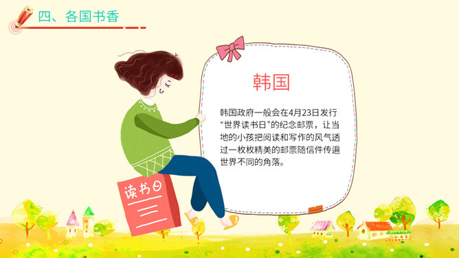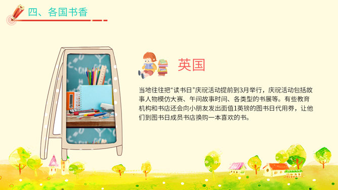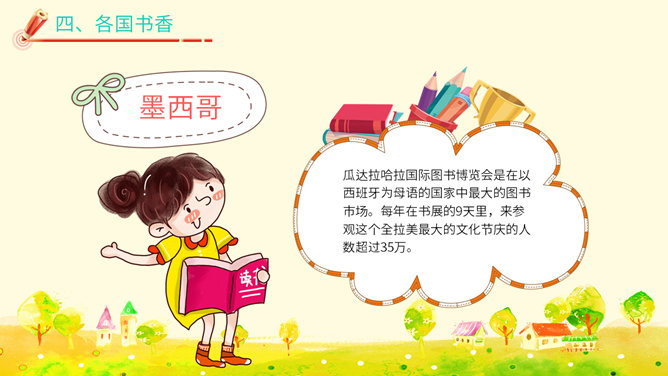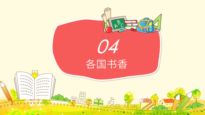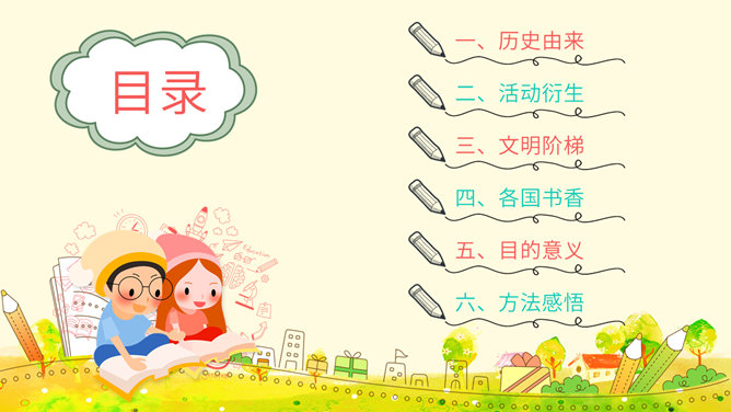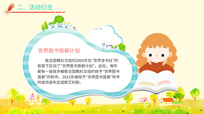 国际读书日读书共享会PPT模板。一套国际读书日主题幻灯片模板,可爱卡通设计风格,也适用小学读书共享。