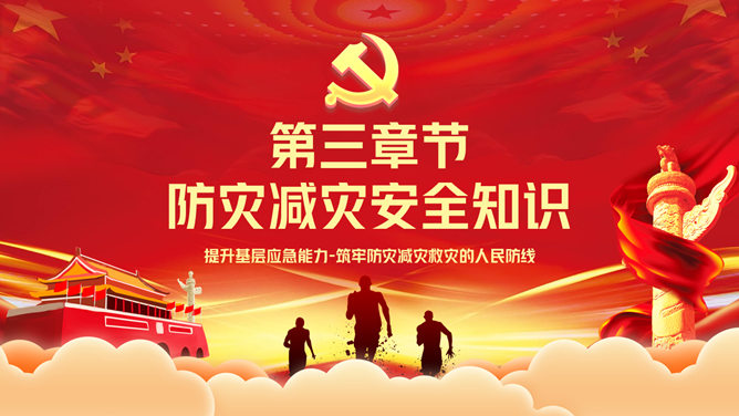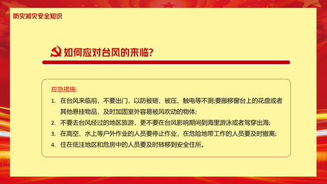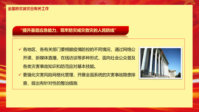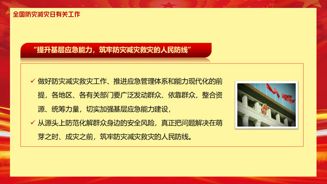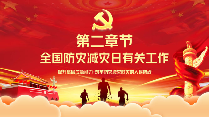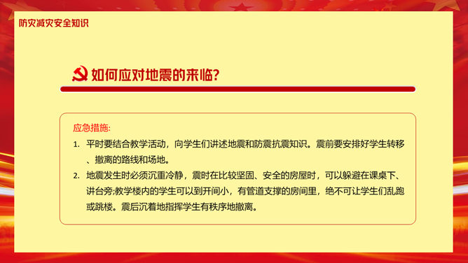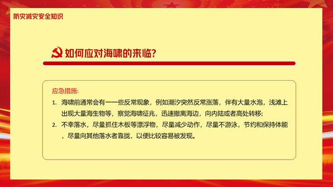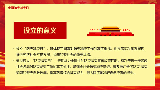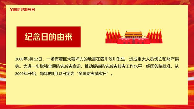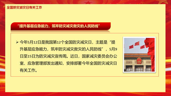 全国防灾减灾日宣扬PPT模板。一套防灾减灾日宣扬课件模板,党整风红黄配色,包括全国防灾减灾日简介、有关作业、安全常识等内容。