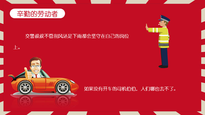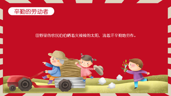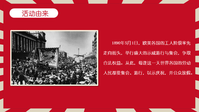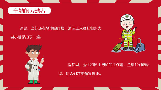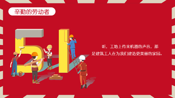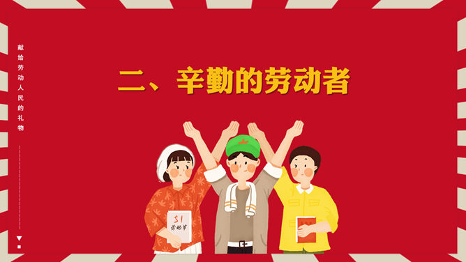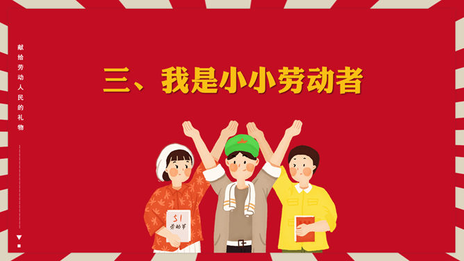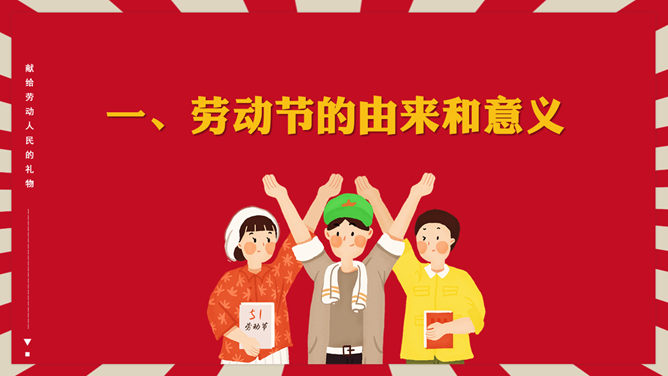 劳动节主题班会PPT模板。一套五一国际劳动节主题班会幻灯片模板,赤色布景,兴趣卡通规划风格。
