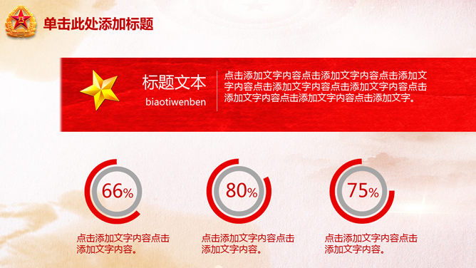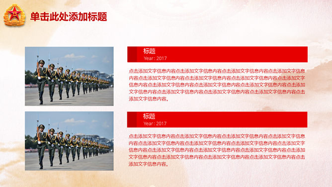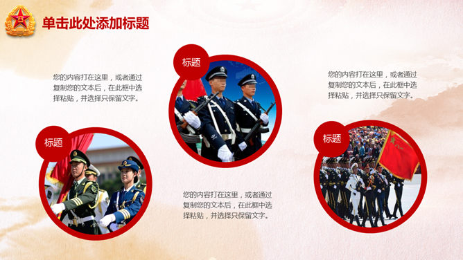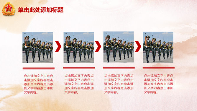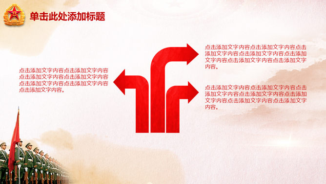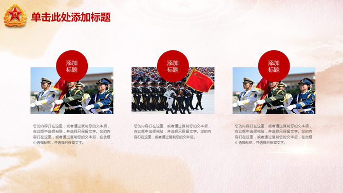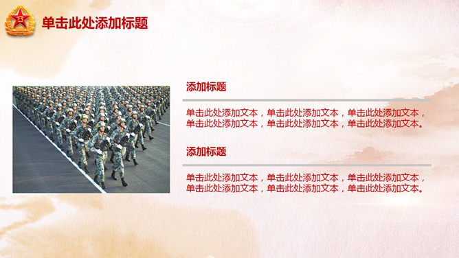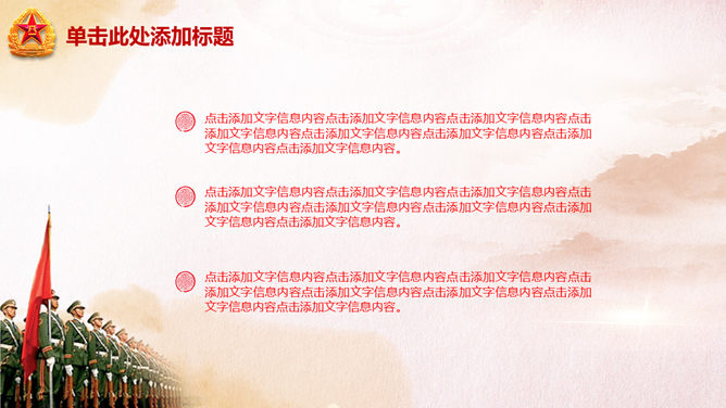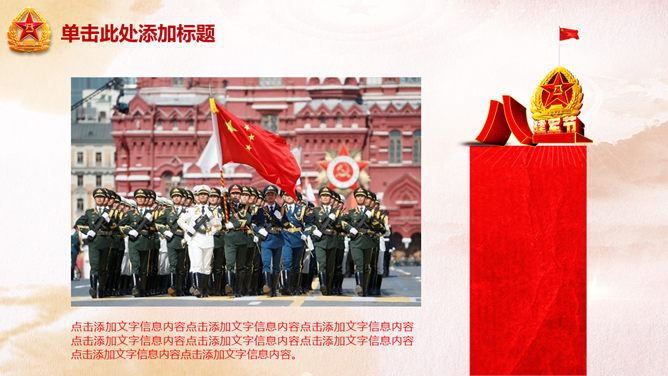 庆祝八一建军节PPT模板。一份用于庆祝八一建军节的幻灯片模板,以恢弘大气的天安门城楼为背景规划。