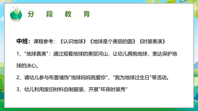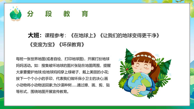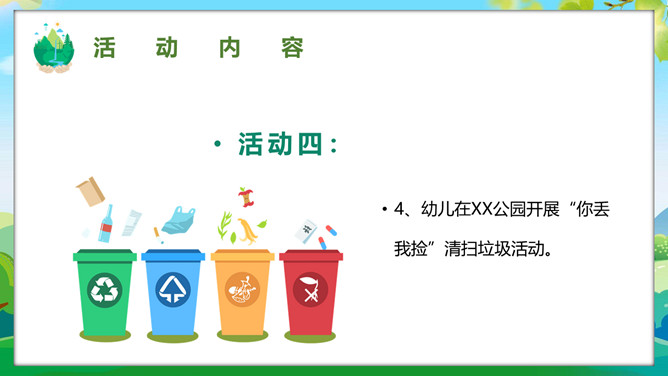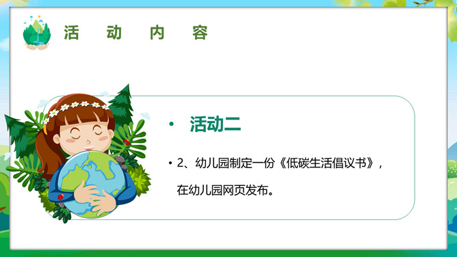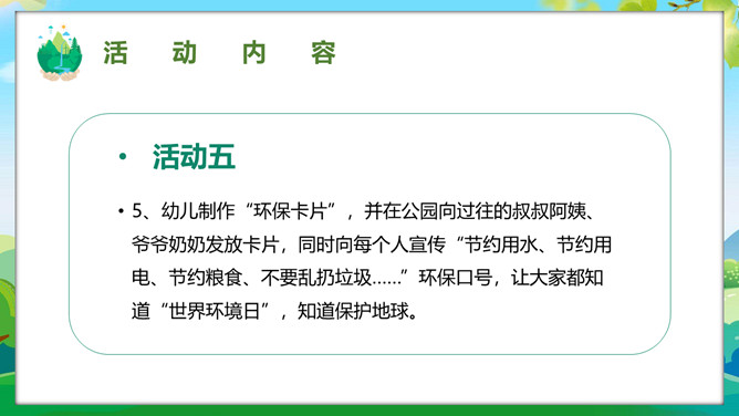 国际环境日活动策划PPT模板。在全球灾难不断的大布景下,通过宣传活动,让大家牢记“咱们只要一个地球”。在咱们寄予厚望、无限神往、纵情享用的日子的同时,更应以感恩之心负起保护的职责,才会使其更加夸姣,更适合咱们生存。
