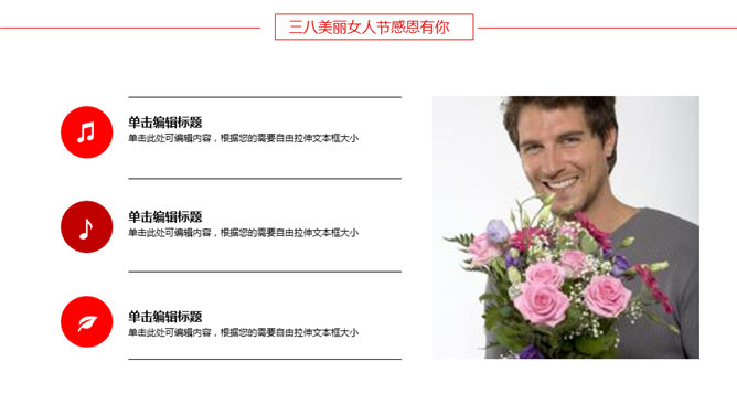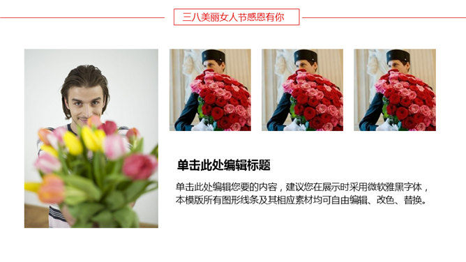 玫瑰花三八女人节PPT模板。一份3.8妇女节主题幻灯片模板,首页以蝴蝶鲜花装饰的38立体字体为背景主体规划。