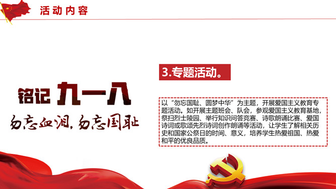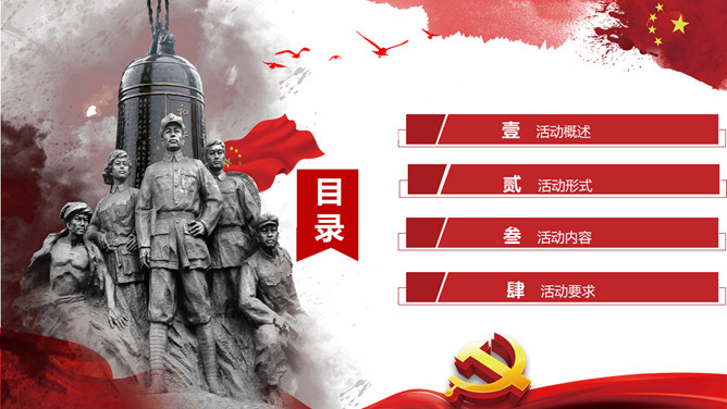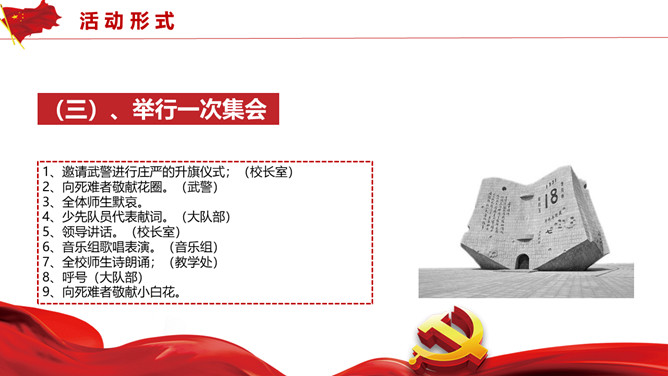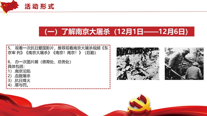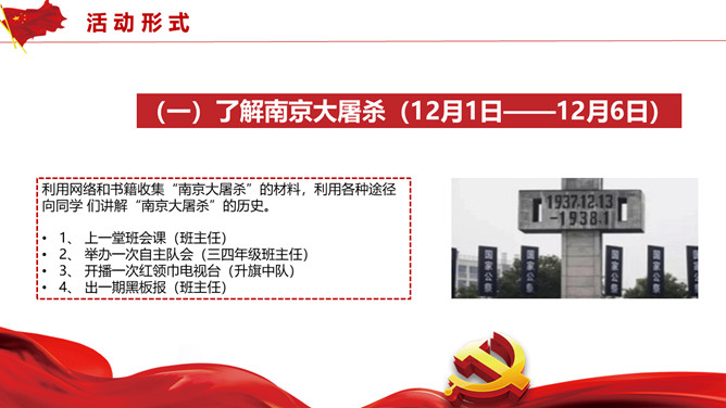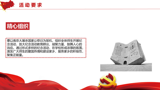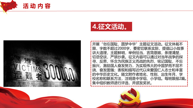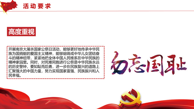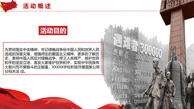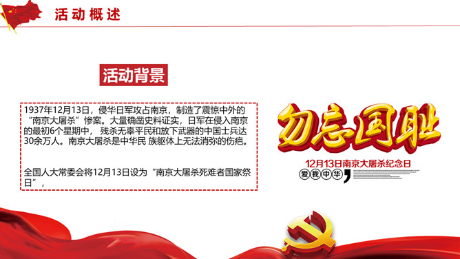 国家公祭日活动策划PPT模板。历史不容忘却未来我们把握。包括活动概述、活动形式、活动内容、活动要求四部分。